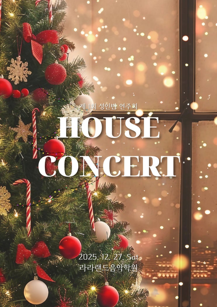 올 한해 누구보다도 피아노에 진심으로, 피아노를 배우고 계시는 라라랜드 성인반 수강생들의 작은 연주회가 열립니다. 연말에 어울리는 재즈 풍의곡과, 따뜻한 음색의 히사이시조, 유키구라모토, 류이치사카모토의 음악, 유명한 쇼팽, 차이코프스키, 라벨의 클래식 음악까지! 다양한 레퍼토리로 홀을 가득 채울 예정이니 기대 많이 해주세요! ㅎㅎ <img src="https://blogthumb.pstatic.net/MjAyNTEyMTBfMjIw/MDAxNzY1MzU4NzQwODU1.U9jMhKC65cQ5o91hReVYLeO_cbXYBaEFc-QWmQ6Ldhog.2fXHHoZMg-oRq7OvFWPW1zW8DpRdZruZOUUYG0vygkMg.JPEG/%C1%A6%B8%F1%C0%BB_%C0%D4%B7%C2%C7%D8%C1%D6%BC%BC%BF%E4..jpg?type=s3" />