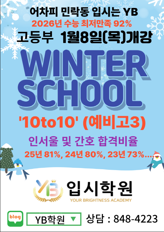 안녕하세요 의정부 민락동 YB입시학원입니다 YB입시학원은 26년 1월8일 고등부 WINTER SCHOOL을 시작합니다 반드시 사전상담예약을 하셔야 원활한 상담을 받으실수 있습니다 고1은 수학 특강 고1,2는 영수특강 고3은 국영수 특강 및 10 to 10 이 진행되며 특히 입시 컨설팅 및 수능대비 모의고사를 진행한다는 점을 참고하시면 될거 같습니다 많은 관심 부탁드리며 학원 번호는 031-848-4223입니다 명실상부 입시학원에 걸맞는 대입입시 실적을 이루어 냈으며 외부원생이나 중학교때 다니던 학생을 대상으로 한것이 아니라 고3때까지 학원을 다닌 학생들을 기준으로 대입입시의 실적을 이루어 냈다는 점을 다시한번 강조합니다 YB입시학원은 국어....... <img src="https://blogthumb.pstatic.net/MjAyNTEyMTZfNzUg/MDAxNzY1ODg5NjY2NDQw.XCYZP12_A1NooPy-xUCT8S3n_WmGbWI5ytKHmRm9GAkg.1jr7pNdU-fDhB4_mYyXH12U52mm6nwRgjp8-CwE-5gIg.PNG/image.png?type=s3" />
