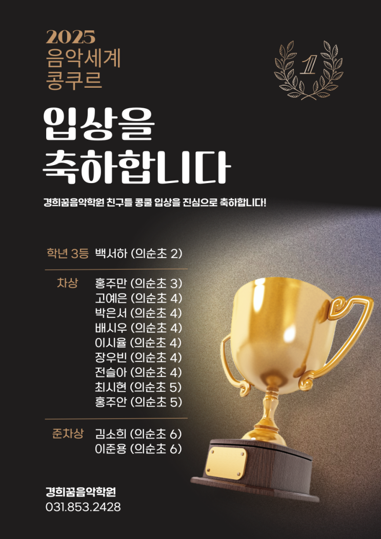 안녕하세요 경희꿈음악학원입니다 3월 새학기를 맞아 감사하게도 신입 문의가 많이 들어오고 있는데, 학부모님들과 상담을 진행하다보면 '콩쿨'에 대해 관심갖고 문의해주시는 분들이 계시더라구요! 우리 학원에서는 매년 콩쿨참가를 희망하는 학생들을 대상으로 '콩쿨반'을 따로 모집하여 체계적으로 준비하고, 참여하고 있습니다 오늘은 작년 콩쿨반 이야기를 적어보겠습니다! 25년도 콩쿨반에는 12명의 친구들이 신청하여 함께 콩쿨을 준비했습니다 그리고 지난 10월, 음악 교육 전문 매체인 음악세계에서 주최하는 '2025 음악세계 콩쿠르'에 참여하여 ✨전원입상✨했습니다!! 콩쿨반 신청이 끝나면 본....... <img src="https://blogthumb.pstatic.net/MjAyNTEyMTdfNzQg/MDAxNzY1OTU4Mzg0ODYw.UTZ0B6P-XRQfLwb5pDp-tUjEKPcLE78oMvBuiPzKq5wg.Xy2aDriu0lKGWX7eRPC0y-eORGy6YWv-zlnuJJXH9Ekg.PNG/%C1%A6%B8%F1%C0%BB-%C0%D4%B7%C2%C7%D8%C1%D6%BC%BC%BF%E4_-001_%2840%29.png?type=s3" />