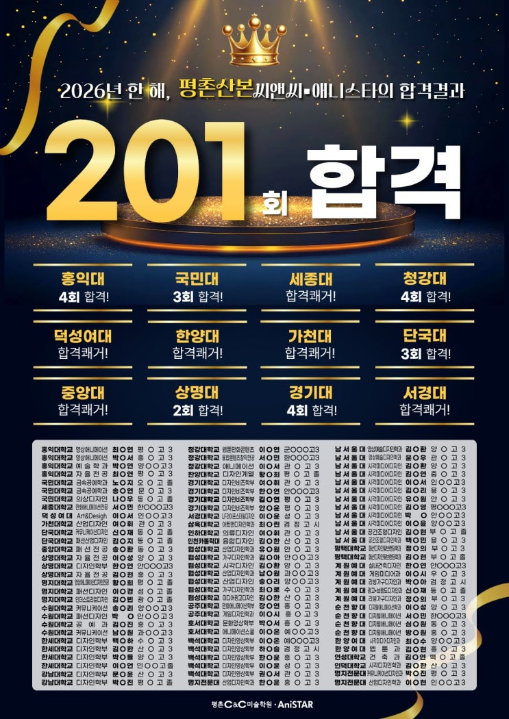[26학년도 총 합격자] 201회 합격 / 평촌학원가 / 미대입시 / 입시미술 / 디자인 / 기초조형 / 애니 / 만화 / 웹툰 / 씨앤씨미술학원