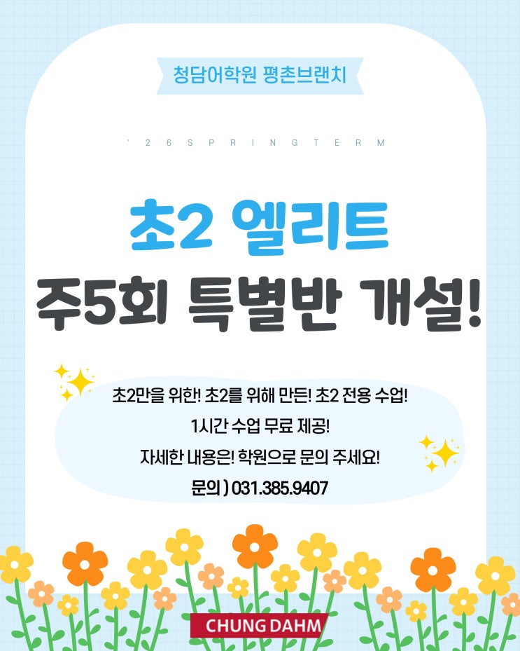안녕하세요! 청담어학원 평촌브랜치입니다 드디어 2026 봄학기부터 새롭게 신설되는 특별 수업을 소개드립니다! 이번에 새로 오픈되는 과정은 초2 · EC4 레벨 전용 클래스로, 아이들의 영어 실력을 가장 빠르고 안정적으로 성장시키기 위한 맞춤형 프로그램이에요! 부담 없이 시작할 수 있도록 특별개설 기념 혜택도 푸짐하게 준비해두었으니, 끝까지 꼭 확인해주세요! 2026 봄학기 신규 오픈! 초2 대상 EC4 전용 클래스 이번 봄학기부터는 초2 학생들을 위해 EC4 레벨만 별도로 특별 개설합니다 ✨ 학습 능력이 급격히 성장하는 시기에 EC 단계의 문해력, 상상력, 서사력 스킬을 탄탄히 다져 중학 영어까지 자연스럽게 이어....... <img src="https://blogthumb.pstatic.net/MjAyNjAyMDNfMTI2/MDAxNzcwMTE5NzQxMzQx.8_0CW2krff7k7ocT8_uQh35mQBoI3FSyAz6MruV6gnEg.taLSt8J6-A3kBHQbggsCOxLkRz4uJ70t5Y-5Lctd-nMg.JPEG/1.jpg?type=s3" />