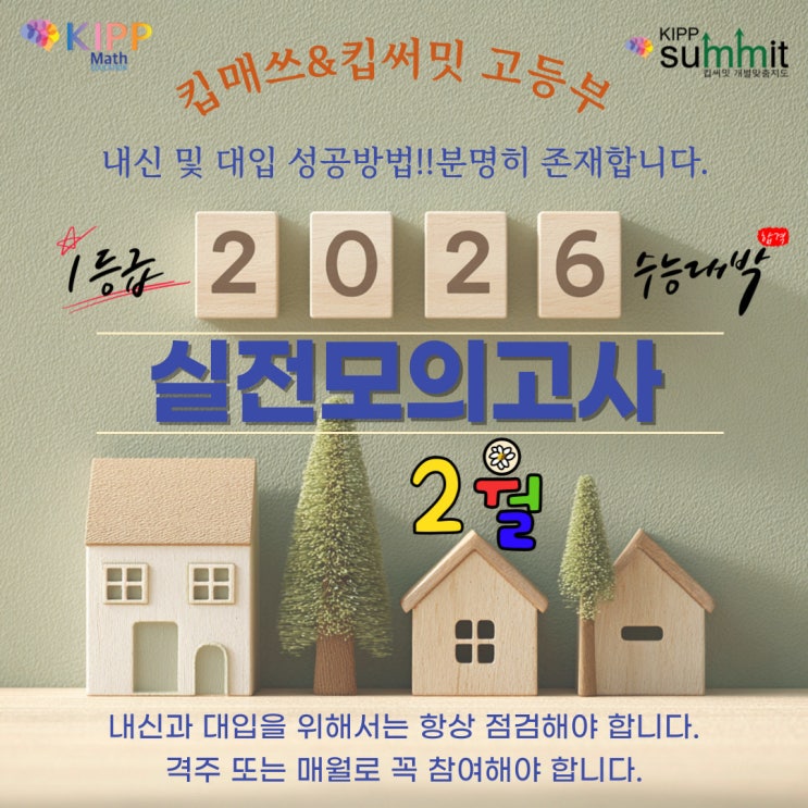 2026년 2월 입니다. 이제는 지난 1월 공부한 공수1, 대수, 그리고 수능범위를 점검하면서 가야 하는 시간입니다. 각 학년에 맞는 범위로 실전모의고사를 치루고 있으니 시험에 응시를 하고 시험이라는 생각으로 대비했으면 합니다. 2월의 수학은 정말로 중요합니다. 내신은 보통은 중간고사 범위를 넘었고 수능은 공통과목과 선택과목의 기본은 진행이 되었을 시기입니다. 이때 1월에 준비했던 부분을 잊어버리면 3월에는 정말로 큰 일입니다. 그래서 반드시 스스로를 점검하고 부족한 부분을 2월에 메꾸면서 기말고사 범위를 마무리 지어주어야 합니다. 수능도 준비해야 하는 고3 입장에서는 3월 모의고사를 준비하는 시기이니 이 이부분에 초점....... <img src="https://blogthumb.pstatic.net/MjAyNjAyMDVfMjEg/MDAxNzcwMjMxMTA1NDYw.fc2NDY0I7sj4GQqDkRhB5F_HjOanQz7nqdh1p4boSzAg.UzB2VLr3G31aT1ffjdDhombJXVtS59jAydWAXYUr_KQg.JPEG/%BD%C7%C0%FC%B8%F0%C0%C7%B0%ED%BB%E7-001.jpg?type=s3" />