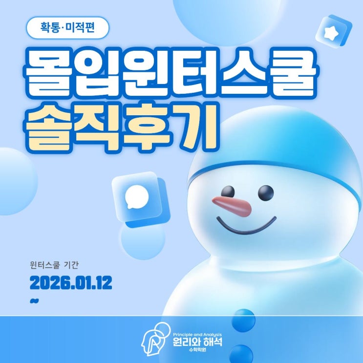 안녕하세요, 원리와 해석 수학학원입니다. 벌써 2월의 문턱에 들어섰습니다. 지난 1월 한 달간, 추운 날씨보다 더 뜨거운 열기로 학원을 가득 채웠던 윈터스쿨의 기록들을 정리해 보려 합니다. ❄️2026 윈터스쿨 : 영채T와 함께하는 몰입의 시간 겨울방학의 추위를 녹이는 학생들의 열정! 미적분과 확률과 통계, 두 마리 토끼를 잡고 있는 우리 아이들은 어떤 변화를 경험하고 있을까요? 1️⃣"윈터 몰입 9시간" , 무엇이 좋았나요? 학생들은 단순히 공부 시간이 늘어난 것을 넘어, '성공하는 습관'을 몸소 체험하고 있습니다. 미라클 모닝과 생활 습관 형성 : 아침 9시 등원으로 규칙적인 아침 시간을 확보하며 '미라....... <img src="https://blogthumb.pstatic.net/MjAyNjAyMDdfODYg/MDAxNzcwNDM0MTQxMzM3.ymDUku7NECUHhrQ03Zhen1gLLGfV4Tb4ETPNlmEKIKog.fbOvIBNGcrXbNb4vEJOMQvK9It6_1wEesRZryHq_g-Qg.JPEG/2026%C0%A9%C5%CD%BD%BA%C4%F0%C8%C4%B1%E2_%282%29.jpg?type=s3" />