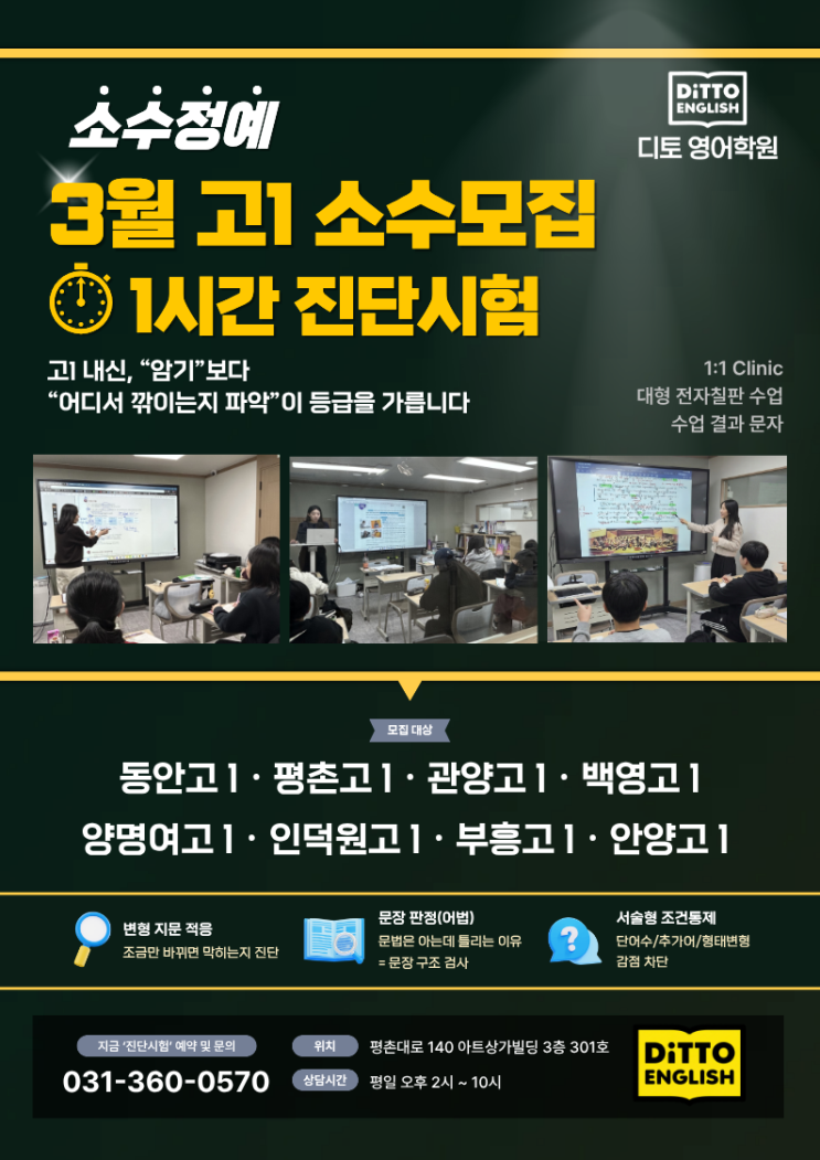 안녕하세요,평촌학원가 [고효율 소수정예·정밀관리] 디토영어학원입니다. 고등부 신입생 소수모집 안내드립니다. 디토영어학원 고등부는 입학 전 1시간 진단시험을 통해 학생의 현재 실력을 정확히 확인합니다. 진단시험은 문법 · 독해 · 서술형 쓰기로 구성되어 있으며, 학생의 강점과 보완이 필요한 부분을 파악한 후 맞는 학습 방향으로 수업을 시작합니다. 디토 영어학원은 ‘결과로 말하는 영어’를 위해 학생 한 명, 한 명을 꼼꼼하게 챙깁니다. ⩗ 디토영어학원 고등부는 섞지않고 한 반에 한 학교만 배치하여 학교별 시험 범위와 출제 경향에 맞춘 내신 중심 수업을 진행합니다. ⩗ 학교별 진도와 시험 유형에 맞춰 객관식 대비를 넘어 서....... <img src="https://blogthumb.pstatic.net/MjAyNjAyMDVfOTgg/MDAxNzcwMjkyMTI3MjI3.TqWsN9SYsWBZyXbPPopSfwj5ZlY6HsuBg_af8Z3Li6gg.R75ZfFfn4x9H8wduuMrMmIU3f0oylfYpVWRKjS5kCDAg.PNG/%C1%A6%B8%F1%C0%BB_%C0%D4%B7%C2%C7%D8%C1%D6%BC%BC%BF%E4..png?type=s3" />