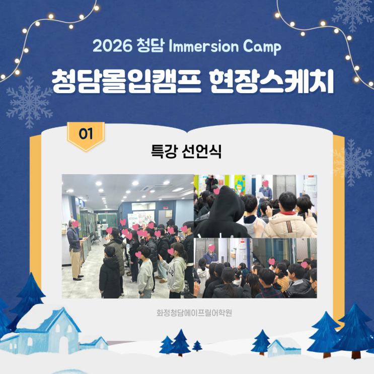 안녕하세요! 2026년 새해를 맞아 화정 청담 에이프릴 어학원에서 진행된 열기 가득한 '2026 청담 Immersion Camp(몰입캠프)' 현장 소식을 생생하게 전해드립니다. 우리 아이들이 겨울방학 동안 얼마나 알차고 즐겁게 영어를 배우고 성장했는지, 그 현장 스케치를 함께 확인해 보실까요? ❄️ ❄️ 2026 청담 몰입캠프 현장 스케치 01. 설렘 가득한 시작, 특강 선언식! 캠프의 첫 단추는 장엄한 특강 선언식으로 시작되었습니다. 아이들은 사뭇 진지한 표정으로 이번 캠프에 임하는 각오를 다졌는데요. 함께 손을 들고 선서하며 학습 의지를 불태우는 모습이 대견하기만 합니다. 02. 빈틈없는 몰입! 수업 시간표 단순히 시간만 때우....... <img src="https://blogthumb.pstatic.net/MjAyNjAxMjdfMTI3/MDAxNzY5NTE2Mjk5NzEw.hB41Ht8vwuVs5v7iiD-i8iMiWTdzfCbwmm1JZ7y455og.3NvgUxTTHnBJnO-05y8UyuhV7S95TtrFZ0uAqfQ-F6Ig.PNG/1.png?type=s3" />