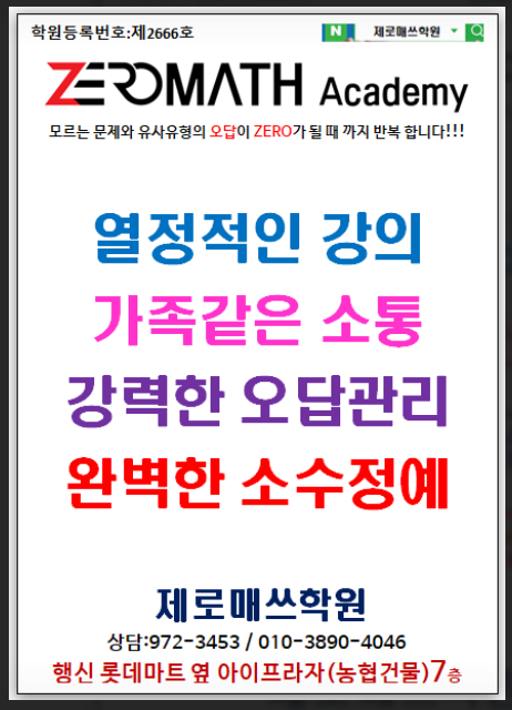 안녕하세요 제로매쓰학원 입니다. 저희 제로매쓰학원은 열정적인 강의 가족같은 소통 강력한 오답관리 완벽한소수정예 학원입니다.! 저희는 의미없이 여러권의 문제집을 풀지 않습니다. 학원에서 분명히 책이 끝나고 심지어 여러권의 책을 끝냈지만 성적 변화와 실력 변화가 없다면 바로 철저한 오답 관리가 안됐기 때문입니다. 저희 제로매쓰학원은 한권의 책이라도 틀리는 문제가 ZERO 가 될때까지 철저하게 오답을 반복 또 반복합니다. 의미없는 선행과 빠른진도를 원하신다면 저희 학원 말고 다른 학원을 알아보셔야 합니다. 저희 제로매쓰학원은 철저한 오답관리를 모토로 내세우고 있기 때문에 늘 시험대비에 자신감을 가지고 있고 성적뿐....... <img src="https://blogthumb.pstatic.net/MjAyNjAxMjlfMTYy/MDAxNzY5NjcwNzQwMjc0.9iq0WUMQUXbjh_SQ98FWipPmEGy0BRaDwDxbIoEHiy4g.3e9O5ARECtip2nJShvBNQHpvS0rxgvrAu1vCKC2Apxkg.PNG/image.png?type=s3" />