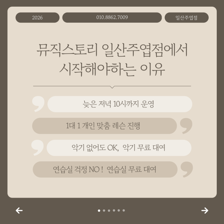 안녕하세요 :) 뮤직스토리 일산주엽점입니다! 2026년 새해 복 많이 받으세요 ♥ 새해가 되면서 새해다짐!을 다들 하잖아요?? 새해를 맞이해서 악기 하나 배울까 하는 다짐을 하시는 분들이 많으신대요! "선생님은 어디서 찾고 악기를 또 어디서 구매해야되고, 레슨비는 또 얼마하는거고!! 연습도 해야되는데 연습실은 또 어디서 해야되는거고!! " 시작하기도 전에 지쳐서 안하게 되는게 현실이잖아요ㅠㅠ 뮤직스토리 일산주엽점에 오시면 모~든 걱정이 해결된답니다! ★ ★ 뮤직스토리 일산 주엽점에서 악기를 시작해야하는 이유! 월, 수 10시 ~ 22시 화, 목, 금 13시 ~ 22시 토요일 10시 ~ 18시 늦은 저녁 10시까지 운영해서 직장인분....... <img src="https://blogthumb.pstatic.net/MjAyNjAxMTRfMTAx/MDAxNzY4MzY4MzA5NDEy.StJ-Ar3d6e6rj_dU3oEhO46DpaLI2zUy5mOlXDWlI58g.BsPo72fELUBoInfe9kefxh-AHy_hMBTD1naaXLj21DIg.PNG/003.png?type=s3" />