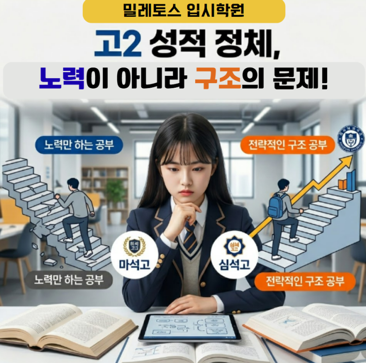 3월 모의고사가 지나고 마석고 심석고 상담을 하다 보면 고2 학부모님들이 공통적으로 하시는 말이 있습니다. “아이 나름대로는 열심히 하는데 성적이 잘 안 오르는 것 같아요.” 사실 이 이야기는 고2 시기에 가장 많이 등장하는 고민이기도 합니다. 고1 때는 공부량이 늘어나는 시기였다면 고2는 공부 방향이 결과로 연결되기 시작하는 시기입니다. 고2에서 성적이 갈리는 이유는 ‘노력’이 아니라 ‘구조’입니다 고2가 되면 ✔ 시험 범위는 넓어지고 ✔ 문제는 더 사고력을 요구하며 ✔ 과목 간 난이도 편차도 커집니다. 이때부터는 “얼마나 오래 공부했는가”보다 “어떤 방식으로 공부했는가”가 점수 차이로 나타나기 시작합니다....... <img src="https://blogthumb.pstatic.net/MjAyNjAzMjdfMjI0/MDAxNzc0NTk2MzQ1NTA0.jD3JW15R0StyWO3PpTlrfonFspujEP5o1bPPkIrO_Ckg.m88w85k6-G59lwIavBLYQz3dxaLBzVB7L4guJ2eYAqEg.PNG/Screenshot_2026-03-27_162526.png?type=s3" />