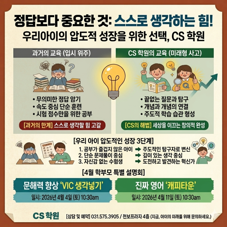 안녕하세요! 별내CS학원입니다. 따뜻한 봄이 갑자기 찾아와서 이제는 더운 기운을 불러오는 듯하는 이 때 저희 CS학원에서 부모님들께 아이들을 위해 꼭 필요한 교육을 안내하고자 합니다. "정답만 외우는 아이 vs 질문하는 아이, 우리 아이의 미래가 달라집니다!" 요즘 아이들이 SNS에 많이 노출되어 있고 특히 다들 휴대폰을 가지고 있으니 스스로 생각하고 알아가는 즐거움을 알기 어려운 세상이 되었습니다. 그래서 우리 아이들이 스스로 생각하는 힘을 기를 수 있도록 돕는 곳이 바로 CS 학원입니다. 완연한 봄 기운이 느껴지는 4월을 앞두고, 우리 아이의 교육 방향에 대해 고민이 많으실 학부모님들을 위해 아주 특별한 설명회....... <img src="https://blogthumb.pstatic.net/MjAyNjAzMjhfODEg/MDAxNzc0NjY1NjkzMzMw.ryQkJisloTAbi1cQrLhKQ8FFBFJzykYsWFsd3E6rwzMg.zw9qHhQUMQ4BYShvsIWXibfp-4wS0RtGcpKSdkkPdPcg.PNG/Gemini_Generated_Image_694c77694c77694c.png?type=s3" />
