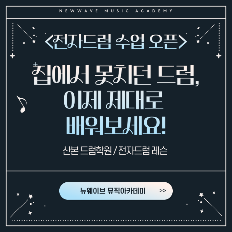 안녕하세요! 산본 중심상가에 위치한 뉴웨이브뮤직아카데미입니다 최근 드럼에 대한 관심이 높아지면서 취미로 드럼을 배우고 싶어 하시는 분들이 정말 많아졌습니다. 하지만 상담을 진행하다 보면 가장 많이 듣는 이야기가 있습니다. “드럼 배우고 싶은데 너무 시끄럽지 않나요?” “집에서 연습도 못 할 것 같아서 고민돼요” 이처럼 많은 분들이 소음과 환경적인 이유로 드럼 시작을 망설이고 있는 상황입니다. 그래서 저희 뉴웨이브뮤직아카데미에서는 이러한 고민을 해결할 수 있는 전자드럼 수업을 새롭게 오픈하게 되었습니다. ✔ 전자드럼 레슨, 왜 선택할까요? 전자드럼은 단순히 소리가 작은 드럼이 아니라 보다 효율....... <img src="https://blogthumb.pstatic.net/MjAyNjA0MDJfOSAg/MDAxNzc1MTIxNTQ0OTk3.rYf2l6B5_h4dYk6fWn8b8xg0OTCaNzpC196xOiq-LWYg.6ouTMaatWRFUK4NjCY0oX060urZT6EnRiLC9brjD7r4g.PNG/1.png?type=s3" />
