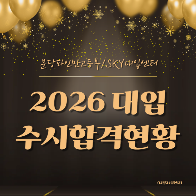 분당파인만학원 2026 대입 수시 합격현황 연말이 다가오면 학부모님들께서 가장 궁금해하시는 소식, 바로 대입 합격 결과일 텐데요 오늘은 분당파인만학원 고등부 / SKY대입센터의 2026학년도 대입 수시 합격 현황을 전해드립니다. 화려한 숫자보다, 한 명 한 명의 과정을 소중히 쌓아온 결과이기에 조심스럽지만 감사한 마음으로 공유드립니다. 2026 대입 수시 합격 핵심 요약 ✨ 의예·한의예·약학 계열 총 8명 합격 학업 역량은 물론 학생부 기반의 꾸준한 학습 관리와 전공 적합성 준비가 함께 만들어낸 결과입니다. 주요 대학 합격 현황 서울대학교 : 3명 연세대학교 : 7명 고려대학교 : 5명 서강대학교 : 2명....... <img src="https://blogthumb.pstatic.net/MjAyNTEyMjRfMTAy/MDAxNzY2NTc4MzYyMDgy.p8Oehmz6K8udj0UeMA--KXLRN0nJIdVKl4mXmo1-Vmgg.cM_JrW5OzY1L5DOkOV5-c2Wg4KO2s84BpCuOh1yH1bwg.PNG/%C1%A6%B8%F1%C0%BB_%C0%D4%B7%C2%C7%D8%C1%D6%BC%BC%BF%E4_-002_%2813%29.png?type=s3" />