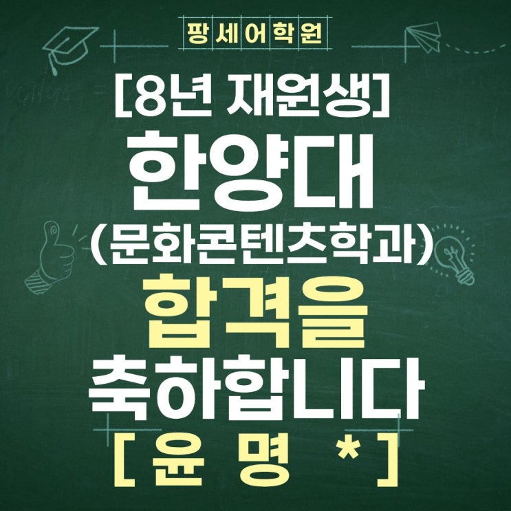 합격을 진심으로 축하합니다! 한양대학교 문화콘텐츠학과에 최종 합격한 8년 팡세재원생의 기쁜 소식을 전합니다. 문화와 미디어에 대한 깊은 관심과 창의적인 사고를 바탕으로 준비해온 과정이 값진 합격으로 이어졌습니다. 앞으로의 새로운 도전을 진심으로 응원합니다! <img src="https://blogthumb.pstatic.net/MjAyNTEyMjRfMzgg/MDAxNzY2NTc4MTA3NjQ5.LkaUZcqxq4PM1L2-DsdWNpFQxhj16CzGaCcQi61xq1kg.xtVVX2zzpPMToISTL5i58FN6gBnN1nVVujoyDvdtQzEg.JPEG/%C0%B1%B8%ED%C0%E7.jpg?type=s3" />