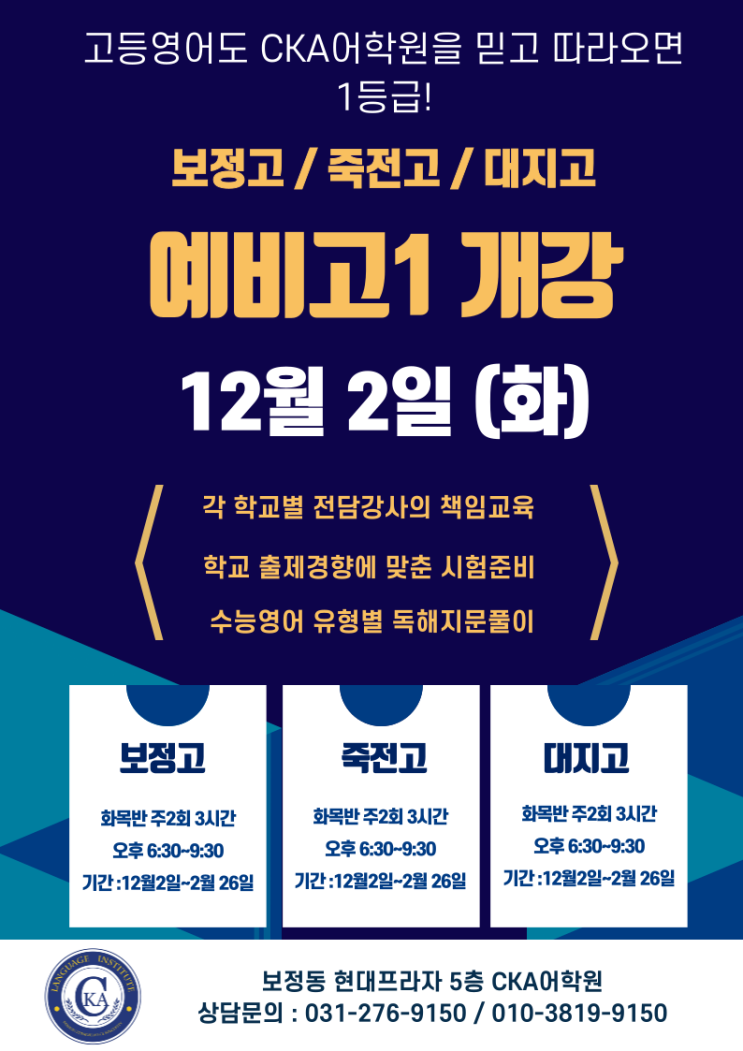 안녕하세요. 보정동 CKA어학원 입니다. 보정고/죽전고/대지고 각 학교별 26년 예비고1반 학생들을 모집합니다. CKA어학원 고등부에서는, ✅ 각 학교별 전담강사의 책임교육 ✅ 학교별 출제 경향에 맞춘 내신 시험 준비 ✅ 내신 뿐만 아니라 수능을 위한 유형별 독해지문풀이 로 수업을 진행하고 있습니다. 상담문의 031-276-9150 #용인보정동영어학원 #보정동초등영어특강 #용인초등영어 #보정동여름방학특강 #CKA영어특강 #초등영어몰입수업 #보정동영어캠프 #초등영어실험수업 #보정동과학영어 #타임포키즈영어 #보정동영어글쓰기 #보정동학원추천 <img src="https://blogthumb.pstatic.net/MjAyNTEyMjlfMjI4/MDAxNzY2OTgyOTE1MzQ3.bBXNOj4ISAaa8jR8kwYfLV1IXTbvlC56nhp2X-OHA1kg.8jGthFw_Vf10NgQp3rkkv02UVX9dN3u5paSOF3JgP3Ig.PNG/IMG%A3%DF4281.PNG?type=s3" />