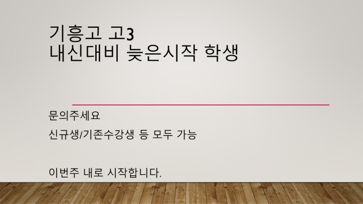 안녕하세요 늦은 내신 문의가 좀 있어서 수업 공지 드립니다. 늦은 내신 시작은 기흥고등학교 3학년 영어독해와작문 수업만 가능합니다. 이번주 안으로 문의 부탁드립니다, <공식적으로는 고3은 마감되었습니다.> 문의는 010-3090-1453으로 연락 주세요. (원장 개인 번호입니다. 늦은시간에는 문자메시지 주시면 됩니다. 기존 수강하다가 쉰 학생들, 신규생들 모두 가능합니다.) <img src="https://blogthumb.pstatic.net/MjAyNjAzMjNfMTI2/MDAxNzc0MjY2MDA4NTcy.elmouKWdxHP23ze8wEI9_ndWq3CT8cqFrsAlKj_MwYsg.5CaNNGC7LLNUpt0nP1Tfe-PloyvSUmsy3MZ81Tiv7MEg.JPEG/%B1%E2%C8%EF%B0%ED_%B0%ED3.jpg?type=s3" />