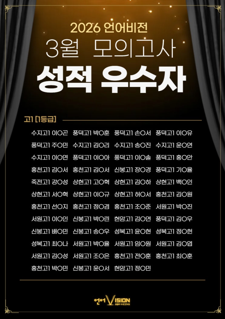 3월 모의고사 성적 우수자 학생들을 소개합니다!! 다음 모의고사는 다른 친구들도 함께 높은 성적을 위해 더욱 열심히 해보아요! 앞으로도 언어비전 국어 학원은 한 명 한 명 사랑으로 정성으로 학생들을 열심히 지도하도록 하겠습니다 :) <img src="https://blogthumb.pstatic.net/MjAyNjA0MDNfMTQ4/MDAxNzc1MTkyMDY1OTYx.FSKJbR8fIlFx2cxBdhqCvfPe1moBB_o5TeJwXj7VDuwg.4evzlYSYtwjckOGbS6v3rYTpmHwap_aisRP6OMRI-HUg.JPEG/001.jpg?type=s3" />