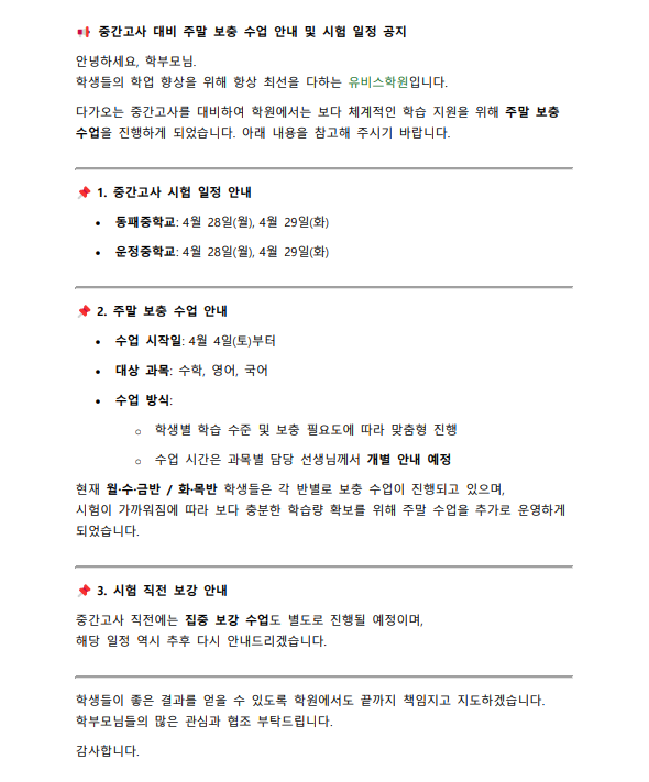 [유비스학원 중등부 중간고사대비 주말수업안내]