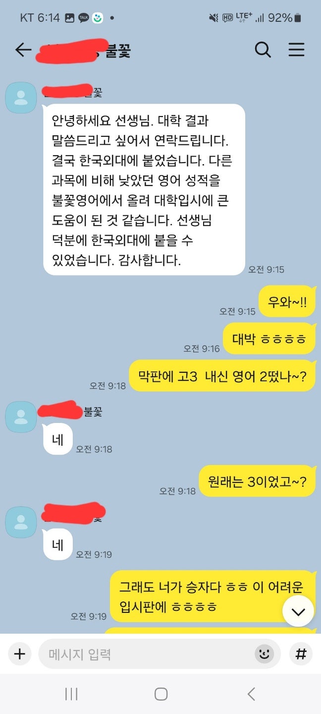 이 친구는 저랑 수능까지 함께 하지는 못했지만 불꽃영어에서 사우고 내신 영어를 3등급에서 2등급(내신 9등급제)으로 끌어올려서 대학교 입시에 도움을 받았다고 연락이 왔습니다!! 너무 축하드립니다!! 학생이 써준 수강 후기 저는 불꽃 영어를 다니기 전에 아무리 공부를 해도 영어가 3등급이었습니다. 스스로 변화가 필요하다는 것을 느낄 때쯤 불꽃 영어를 친구의 추천을 통해 알게 되었습니다. 처음에 갔을 때 영어를 처음 배울 때처럼 기초부터 시작하였습니다. 처음에는 영어 공부를 이렇게까지 해야 할까라는 생각이 들었습니다. 하지만 시간이 지나다 보니 1~5 형식과 같은 기본 개념을 잘 다져놓아 아무리 긴 문장이라도 해석이 빠르....... <img src="https://blogthumb.pstatic.net/MjAyNTEyMTlfNzUg/MDAxNzY2MTM2NDMzNTA5.nENTGuQEfDVXplqx2rhzU6xiCGp43U7QgMJ1JJTY7pAg.VPvySHKRjgr0A4PSD0UIZFzX0zcBmN2CuJBu-aRQ5bMg.JPEG/KakaoTalk_20251219_181626239.jpg?type=s3" />