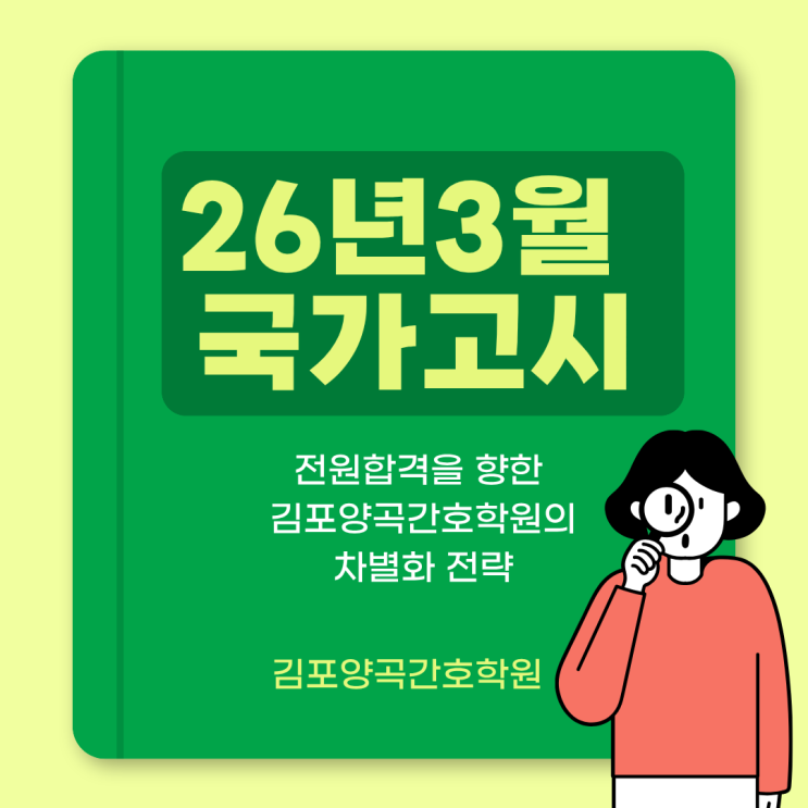 안녕하세요 제대로된 간호조무사 양성을 위해 노력하는 김포양곡간호학원입니다. 얼마전 내년 국가고시 3,9월 시험 날짜가 발표 되었습니다. 저희 김포양곡간호학원은 올해부터 바뀐 cbt 방식 국가고시에 대비한 준비를 하고 있습니다. 한 과목이 끝날때마다 강사님들이 출제하는 단원평가를 통해 문제풀이 경향도 파악하고 특히 쳐지는 과목이 생겨 과락의 위험성이 생기는걸 방지하며 학생 관리를 하고 있습니다. 올해부터는 cbt방식으로 시험이 몇일동안 오전/오후로 나뉘어(시험은 1회 신청) 출제 회차가 많다보니 기존에 내지 않던 문제 유형들도 나오고 있습니다. 최대한 최신 기출문제 파악하고 동향을 살펴 다양한 문제 풀이로 대비하고....... <img src="https://blogthumb.pstatic.net/MjAyNTEyMjJfMTkg/MDAxNzY2MzY4NDc2MDk3.HinYCMWLPWbManBK9vslkMGIQgkN1iHA4ELjUgOMt_0g.N3fOC6yzU7kov7SAWhLv6-M26lBJXPpM0nIJE-1rwm0g.PNG/1.png?type=s3" />