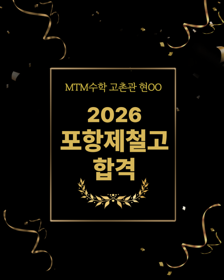 MTM수학 고촌관 현OO 2026 포항제철고 합격을 축하합니다! <img src="https://blogthumb.pstatic.net/MjAyNTEyMjJfMjkz/MDAxNzY2NDAzNDg1OTU3.qaMxxMYu_vK_jQHKw-HX6ZHIV8r5DN_68hEsHhFIMWYg.WLp5MUlZ7xbXF9rYI1meL4Xwj-npTYnnGw1DP5mkGfUg.PNG/IMG%A3%DF8264.PNG?type=s3" />