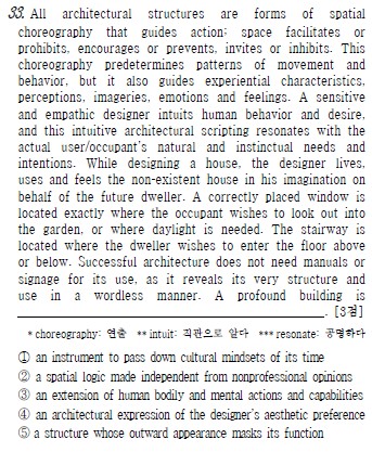 EFS 안녕하세요 토대 영어입니다. 전통적으로 고난도 문제로 여겨지는 빈칸 문제는 이번에는 무난하게 출제되었습니다. 그중에서도 오답률이 높았던 33번 문제를 살펴보도록 하겠습니다. 먼저 첫 문장과 두 번째 문장을 보시면 ‘건축 구조물이 행동을 유도하는 '공간적 연출' (spatial choreography) 이라고 하면서, 이는 또한 경험적 특성, 지각, 심상, 느낌 등을 유도한다고 하였으므로, 이로부터 우리는 건축이 인간의 행동과 욕구와 직접적으로 관련됨을 알 수 있습니다. 다음으로 이에 관해서 좀 더 자세하게 언급하고 있는데요, 즉 세심하고 공감적인 설계자는 인간의 행동과 욕망을 직관적으로 아는데(intuits), 이를 ‘직관적....... <img src="https://blogthumb.pstatic.net/MjAyNjA0MDZfMTUw/MDAxNzc1NDUwNTYwMTc4.iDHFhk1z7Sp1vBVo2i2xf7q4sBqbMWJXdieaC4OLvD8g.HVMeIFwX6S4BCQO7YOabXrN_GFh0KECaSZH5Ge4EHCog.JPEG/33.jpg?type=s3" />