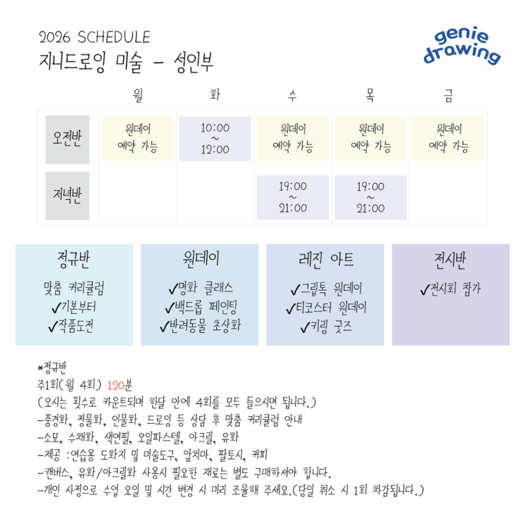 2026년 강릉 지니드로잉 미술학원 성인 취미반 수강일정입니다 오전반과 저녁반 선택 가능하시고 수업은 개인별 희망하시는 주제로 진행됩니다 기초반에서는 그림 그릴 때 사용되는 기본적인 내용을 함께 배우실 수 있습니다 인물, 풍경, 보태니컬, 사물, 동물 등 원하시는 주제로 수업 커리큘럼 진행합니다 매주 추천드리는 수업으로 진행하시기도 하고 그려보고 싶은 주제나 사진을 찾아오시면 함께 이야기해보며 그려보기도 합니다 그림을 배워본 적이 없어도 가능합니다 다양한 작품을 도전하며 나를 위한 시간을 가져보세요 매년 12월 지니드로잉 미술에서 진행되는 전시회에 참여 가능합니다 크기나 재료 제한이 없어 작은 그림들....... <img src="https://blogthumb.pstatic.net/MjAyNjAyMTFfMTMy/MDAxNzcwNzg0NjA0Njgy.8CL9Ch0R9EachmDCLOYtNy9WTmtpj3_6Ek8_nPKuI-Ig.vgoYQZD5C1RgC8ZdK-yzPd7IVHq0Ta4asnMD1gp0zsIg.PNG/2026%C0%CE%BD%BA%C5%B8.png?type=s3" />