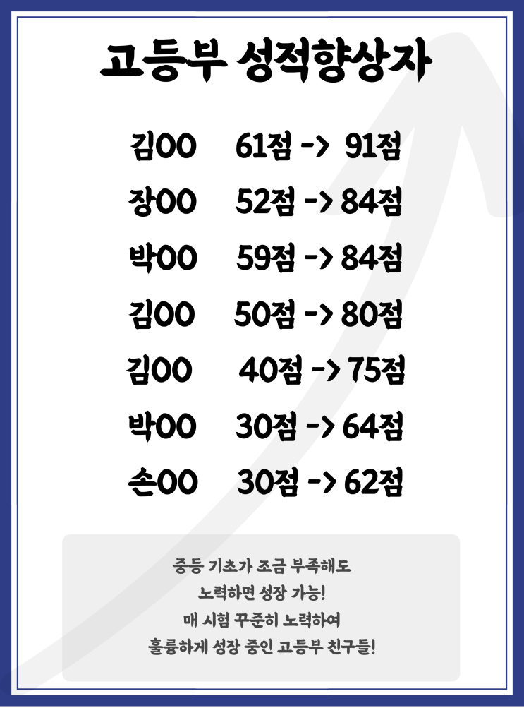 중학교에서 A받던 우리 아이가 고등학교 진학 후에 영어 성적이 안나온다?! 명확한 이유가 있습니다. 고등부 점수가 안나오는 세부적인 이유는 여럿 있을 수 있습니다만 크게는 세 가지 능력 부족에 기반합니다. 첫번째, 중등 문법 기반이 없는 경우, 두번째, 단어가 부족한 경우, 세번째, 문해력이 부족한 경우, 이런 문제들이 하나 둘 섞여 있는데, 명확한 이유에는 명확한 해결법도 있는 법입니다. 첫번째, 중등 문법 기반이 없는 경우, 기본 해석부터 잘 안되고 어법 문제도 문법 기반이 없으니 외워야하는 사항이 너무 많아지는 경우입니다. 많은 아이들이 겪는 문제인데 중등 과정 시험에서 나오는 문법만 접하고 그 외의 전반적인 영어문....... <img src="https://blogthumb.pstatic.net/MjAyNTEyMTNfMTI4/MDAxNzY1NjI3NTM3ODY0.nSO-E7cQkDp6H0qbWtcqTG9v7ba4HqhYLdw6AtiJCFIg.EeV6R6TUM2TQ71gaMO7b6nMqeiYquRVqP6UbCL0P0ncg.PNG/%C1%A6%B8%F1%C0%BB_%C0%D4%B7%C2%C7%D8%C1%D6%BC%BC%BF%E4.png?type=s3" />