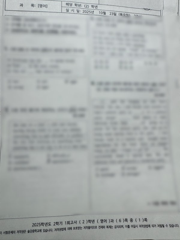 <솔강중 2학년 2학기 기말 영어 시험이 어렵게 느껴진 이유> 이번 시험은 단순히 교과서 암기나 기본 문법 적용만으로 해결하기 어려운 구조였습니다. 아이들이 못했다기보다, 시험이 요구한 사고의 결이 달라진 시험이었어요. 학생들이 느낀 어려움에는 이유가 있습니다. 지문 난이도 변화 - 총 3개의 지문이 처음 등장하는 소재, 일부는 교과서 지문을 그대로 쓰지 않고 변형한 형태 - 익숙한 문장이 아니라, 처음 보는 글을 읽고 맥락을 파악해야 했기 때문에 독해 부담 가중 2. 시험 범위로 제시되지 않은 단어들이 다수 포함 - 단어를 알고 있느냐'보다 문장 흐름과 문맥을 통해 의미를 유추할 수 있는지, 다의어를 각 의미를 아....... <img src="https://blogthumb.pstatic.net/MjAyNTEyMjBfMTY1/MDAxNzY2MjAwODg2Nzc2.e7iMZYtoWOSjUU98_uvxtsVztS_qHvk2EmP1Pq_1vgsg.KJBr7ELS82vJdabmbZ_eVJfSXgsF32hf4KhYJBcw7m4g.JPEG/KakaoTalk_20251023_221730169.jpg?type=s3" />