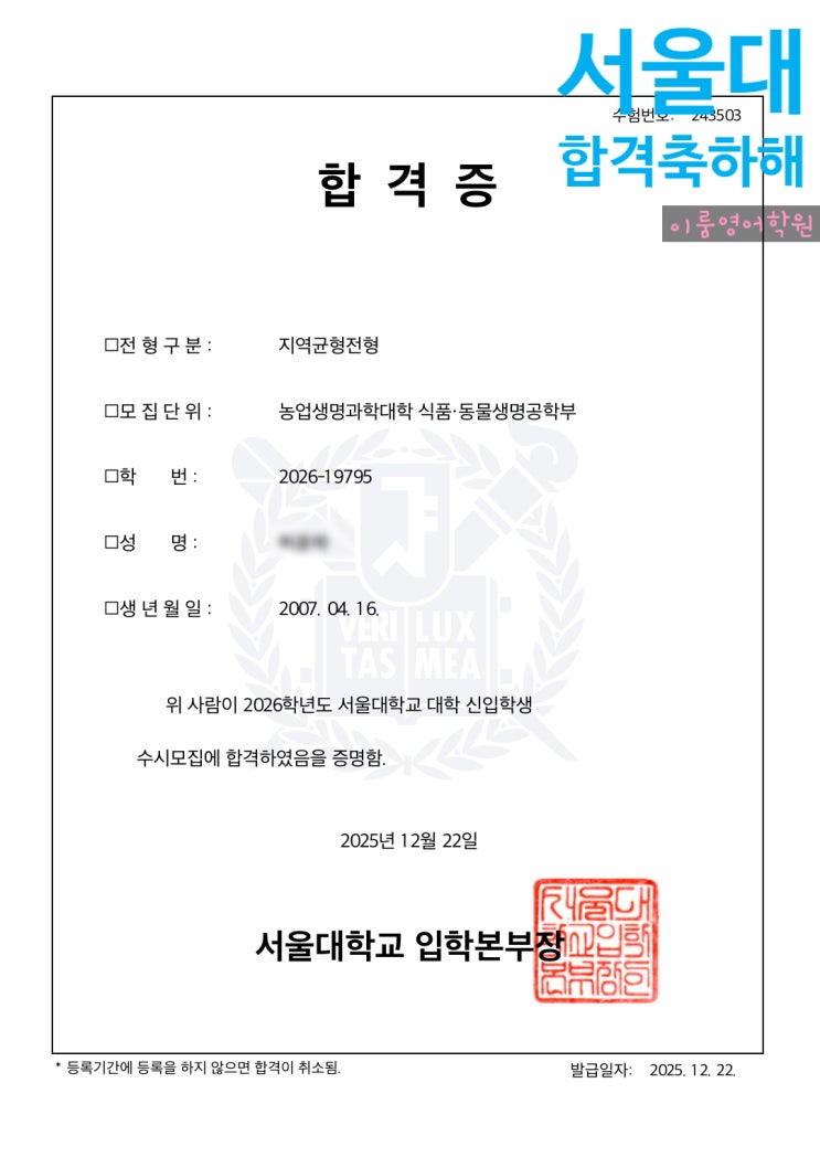 오늘 정말 기분 좋은 소식을 들었다. 이룸영어에 중학생 때부터 다니던 한 친구가 서울대, 연세대, 고려대에 모두 합격했다는 이야기였다. 순간 놀라움이 먼저 왔고, 그 다음에야 기쁨이 밀려왔다. 처음 그 친구를 만났을 때부터 여러 장면이 떠올랐다. 학원이 좁아 냉장고 옆에서 공부하던 때, 잠을 거의 못 자고 힘들게 걸어오던 모습, 버티다 못해 고민을 털어놓던 순간들. 일주일에 단어 2,000개를 외우는 과정도, 난이도 높은 지문으로 깊은 토론 수업을 함께하던 시간도 결코 쉽지 않았던 기억으로 남아 있다. 멘탈이 흔들릴 때마다 다시 중심을 잡고 끝까지 버텨낸 과정이 지금의 결과를 만든 것 같다. 이런 결과는 우연이 아니라는 생각....... <img src="https://blogthumb.pstatic.net/MjAyNTEyMjJfMjc4/MDAxNzY2NDEyMzk5MjM1.Vr6u12_B_tUAuA8EGqO8impprIHJJ8gA_uYY-IbN9o4g.bXYct44XTtX1ibitBZPHXeDUp4hC9e1s3tqD-lKqOMEg.JPEG/KakaoTalk_20251222_201458355.jpg?type=s3" />