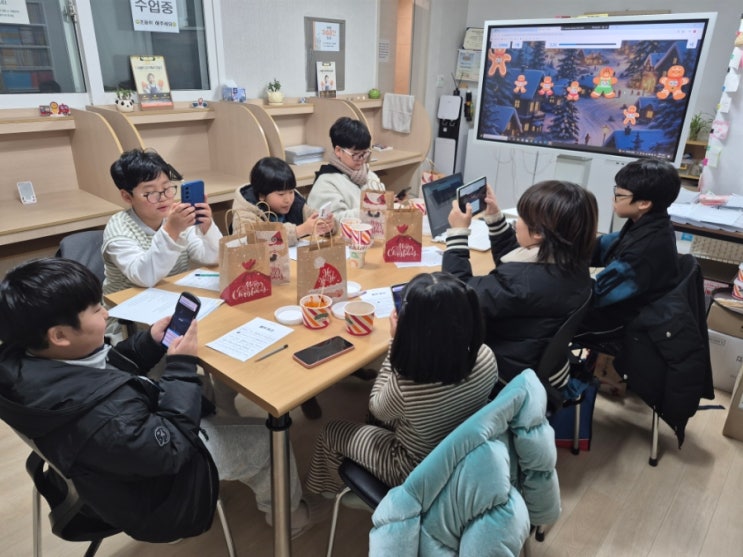 안녕하세요 ~^^ 도봉구 쌍문동 백운초 앞 영어학원 영어독서교실 고심하는 서쌤입니다. 오랜만에 방학식 겸 크리스마스이브로 즐거운 이벤트 데이를 진행했습니다. 오랜만의 이벤트 데이라 아이들이 너무 좋아했어요. ^^ 간식 먹으며 빙고 게임을 하고 캐럴송도 부르고 퀴즈 배틀도 진행했습니다. 퀴즈 배틀 개인전도 하고 팀전도 했어요. 산성비 게임처럼 뜻이 내려오면 영어 타자로 스펠을 입력하면 사라지는 게임도 새로 나왔더라고요. 새로운 게임이라 재미있긴 했는데 스펠을 입력하는 게 아직은 좀 어려워해서 객관식으로 답을 선택하는 게임을 위주로 했습니다. 배경도 그렇고 귀여운 진저브레드맨 캐릭터도 그렇고 한겨울의 크리스마스 분....... <img src="https://blogthumb.pstatic.net/MjAyNTEyMjVfMTI3/MDAxNzY2NjQ0NzU1NDY1._Dtf3mLqaDhS8Zg9H0OKAMTj1nznvCSpCxPADtEzOGYg.-Gf25SoRqYt_ahlIEHqN7imcakXHC1myn6ptKE1Ow2Yg.JPEG/900%A3%DF20251224%A3%DF172257.jpg?type=s3" />
