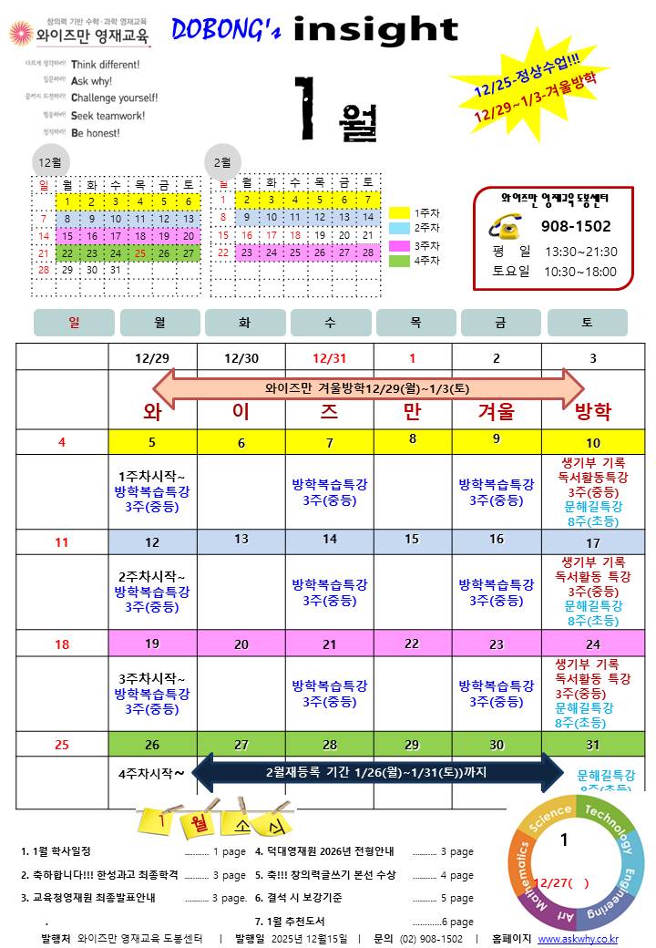 벌써 한해가 다가고 25년의 마지막 주를 보내고 있네요. 이번주부터 학교 겨울방학이 시작되었어요. 긴 겨울방학 알차게 보내서 다음학기에는 더 발전된 모습이 되었으면 좋겠습니다. 2026년에는 모두에게 더 즐겁고 더 행복하고 좋은 일이 더~~많이 생겼으면 좋겠어요. 26학년도 1월 소식지 안내 드릴게요. 와이즈만 겨울방학 : 12/29(월)~ 1/3(토) 푹쉬고, 재충전해서 활기찬 새해를 맞아 보아요^^ 겨울방학 특강(중) : 중학생 친구들을 위한 수학과학 복습특강과 독서활동 특강 진행됩니다. 복습특강에서는 새학기를 미리 준비해보고, 독서활동 특강에서는 고등 생기부 교과세특에 기록 가능한 도서를 선정 미리 작성해 봅니다. 겨울방학 특강....... <img src="https://blogthumb.pstatic.net/MjAyNTEyMjZfNTkg/MDAxNzY2NzM2OTc3MTAz.tnGb0l6zKRZ5ef73-KinGC6bdsDehMdMo_O8Kf8Pmkog.r2qQZnXplnu4CwWbS6dITH54cHnZsrvpcPVnM8SIHHsg.JPEG/%BD%BD%B6%F3%C0%CC%B5%E51.JPG?type=s3" />