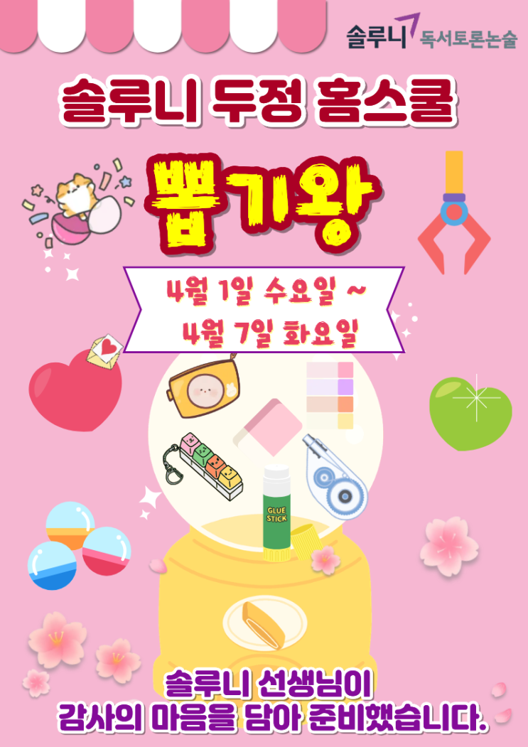 안녕하세요 솔루니 천안입니다. 솔루니 두정 홈스쿨에서 회원들을 위한 감사의 뜻으로 4/1~4/7 일주일동안 뽑기왕 행사를 진행합니다. 자신이 가져갈 선물을 직접 뽑아가는 재미를 느껴보아요~ 즐거운 이벤트와 함께 하며 성장하는 친구들이 되었으면 좋겠네요. 항상 응원합니다~ ^^ ◈ 솔루니 천안아산충남 교육국 : 041. 414. 0909 < 각 지역 교습소 , 학원을 검색해도 편리합니다. > ◈ 아래 오픈채팅으로 문의해주세요 https://open.kakao.com/o/gly1A1dh #천안아산독서논술 #솔루니독서논술 #책읽기 #글쓰기 #어휘력 #표현력 #문해력 #성장로그 #천안솔루니독서논술 #천안솔루니백석교습소 #두정동독서논술 #내신완성 #솔루니수행평가....... <img src="https://blogthumb.pstatic.net/MjAyNjAzMjdfMjE1/MDAxNzc0NjAzNDY1MzE4.Qg0zTnY1oG88xZQhMDj5vvw_wDGRS0VsRiD9R1Ky9lkg.sUuT_mfc8R7Lnl_us8it4tbG7SJwYjq32a8CHYuSrngg.PNG/%B5%CE%C1%A4%C8%A8_%BB%CC%B1%E2%BF%D5_%2804010407%29.png?type=s3" />