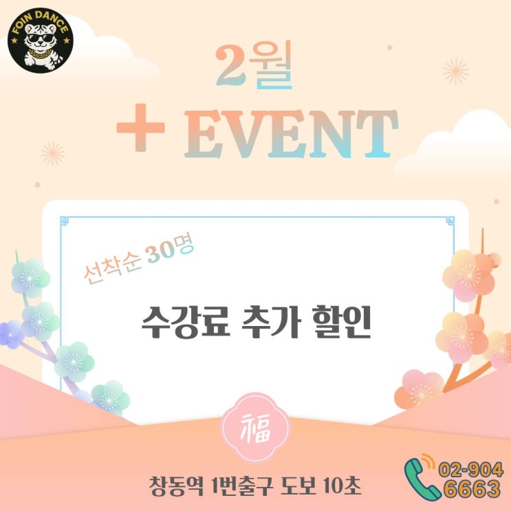 도봉구 노원댄스학원 찾는분들 이벤트 소식 가지고 왔어요 바로 2월 플러스 이벤트에요 선착순 30명에게 수강료 추가 할인 혜택을 드리고 있어요 수강료 할인 에다가 추가로 할인 혜택을 받을수 있어요 이건 무조건 혜택을 받아야 한다는 사실~!~!! 지금 바로 시작을 못하는분들은 어떻게 하나요? 네~ 지금 혜택을 받아 등록 하시고 시작날을 정할수 있어요 미리 등록 혜택을 받을수 있으니 편하게 놀러 오시면 되세요 이미 도봉구 노원댄스학원 찾는분들이 많이 사랑해 주시는 댄스학원이지만 더욱 큰 사랑을 받고 싶어서 이렇게 할인 혜택을 준비 했으니 꼭~ 받아 보세요 포인댄스만의 혜택도 누릴수 있어요 우선 수시모집이니 지금 바로 등록....... <img src="https://blogthumb.pstatic.net/MjAyNjAyMDJfMTgz/MDAxNzcwMDExOTI0NzM2.pinehauohk-rrscLl4Nv0g2l6imBaAKa2zNGTgbBx-wg.BlU0KwFRkzR8iJncmwb2Zv-Fr0h49wklM6T2DLzP6Egg.JPEG/2%BF%F9_%C0%CC%BA%A5%C6%AE.jpg?type=s3" />