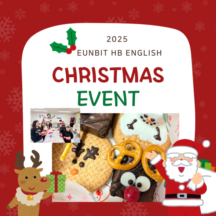 2025. 12. 24 은빛엘리트해법영어 - 2025 Christmas Event - 안녕하세요. 초·중등 영어 전문 은빛엘리트해법영어입니다. 2025년 12월, 아이들과 함께한 특별한 크리스마스 이벤트가 즐거움과 배움 속에서 마무리되었습니다. 단순한 ‘행사’가 아닌, ⭐️영어 실력 향상과 추억을 동시에 잡는 시간이었기에 그 현장을 블로그에 남겨봅니다. ⸻ Baking Class in English 이번 크리스마스 이벤트의 하이라이트는 우리 은빛이들이 가장 좋아하는 바로 Baking Class였어요! 오예스, 쿠키, 마시멜로우, 빼빼로 등의 스낵를 활용해 ✔️ 루돌프 오예스 만들기 ✔️ 울라프 비스킷 만들기 아이들이 정말 좋아할 수밖에 없는 활동이었죠! 특....... <img src="https://blogthumb.pstatic.net/MjAyNjAyMDhfMTA0/MDAxNzcwNTU5MjMyODky.m0PguRtB7DSkhqOGsxTYVYdDOuKJbQq10CidoaGLY64g.2-jVBSu_AvqnXSAlXjk2VsrwqO7tS70cknaUAPTrnfcg.PNG/%B7%B9%B5%E5_%C8%AD%C0%CC%C6%AE_%B1%CD%BF%A9%BF%EE_%BB%EA%C5%B8%C5%AC%B7%CE%BD%BA_%C0%CF%B7%AF%BD%BA%C6%AE_%C5%A9%B8%AE%BD%BA%B8%B6%BD%BA_%B0%A8%BC%BA%C0%C7_%C4%AB%B5%E5_%B4%BA%BD%BA_%A3%AD_1.png?type=s3" />