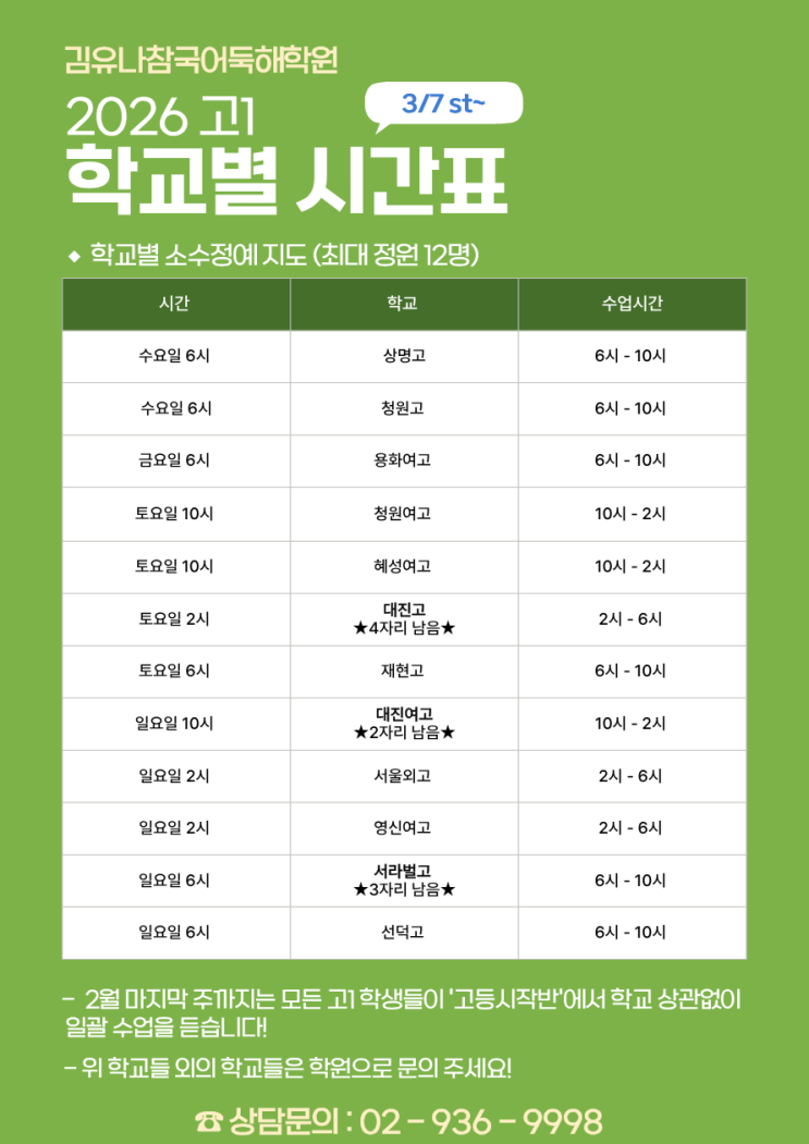 안녕하세요 김유나학원입니다 :) 고1 재원생들의 고등학교가 배정됨에 따라, 저희도 3월부터 시작될 학교별 수업을 위해 바쁘게 준비하고 있습니다. 오늘은 고1 시간표를 한번 더 안내드리며, 마감 임박 반을 공지드리려 합니다! 내신 대비는 시험 약 5~6주 전부터 시작됩니다. 그 전까지는 모의고사 수업을 계속 진행하며 3월 모의고사를 대비하게 됩니다. 현재 대진고, 대진여고, 서라벌고반은 남은 자리가 많지 않습니다. 등원을 희망하시는 학부모님들께서는 학원으로 빠른 연락 주시면 감사하겠습니다 ^^ 위 학교들 외의 학교들은 학원으로 문의 주시면 안내드리도록 하겠습니다. 언제나 처음의 그 마음대로, '읽을 수 있는 학생'....... <img src="https://blogthumb.pstatic.net/MjAyNjAyMDhfODkg/MDAxNzcwNTM5MDAzMzc3.4RwYqsK5F4XM2au3FEOopnZXE2pCDxiTw86-H0BRUsQg.YM7dFC-fVueHInw4hjB55H-JV4CEt2QSbuOu-Tl4zu4g.PNG/%C1%A6%B8%F1%C0%BB_%C0%D4%B7%C2%C7%D8%C1%D6%BC%BC%BF%E4._%281%29.png?type=s3" />