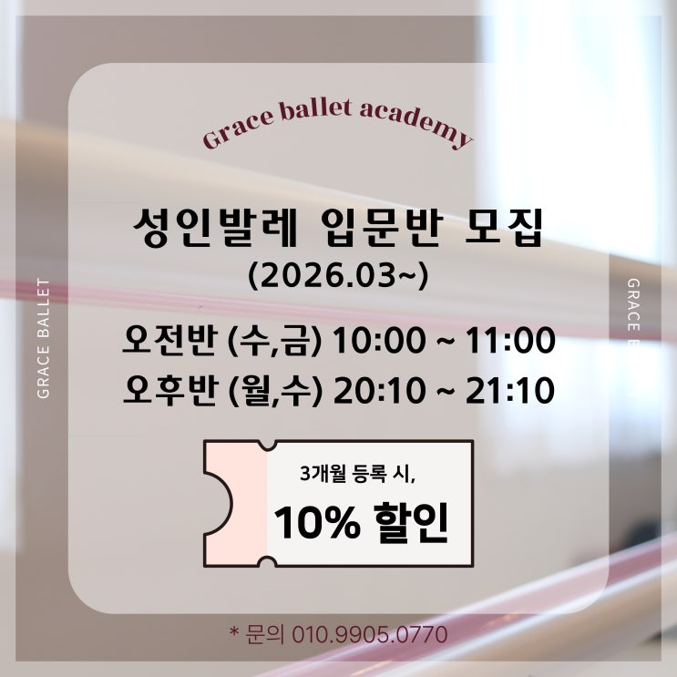GRACE BALLET 안녕하세요. 그레이스발레학원 입니다 :) 2026년 3월 첫 개강 입문반 모집 중 입니다✨ 기존 반에 섞여 수업을 하지 않는, 모두 다같이 맨-처음반 개강입니다. 아주 오랜만에 오전 입문반도 개강되니 많은 관심 부탁드립니다! * 이번 입문반은 그동안 문의 주셨던 분들이 많아 더 빠르게 정원 마감 될 예정입니다. 학원에 연락주시면 방문 or 전화 상담 후 원서 등록되는 순으로 정원 마감됩니다. 빠른 고민해주시고 연락주세요 < 신규 성인 입문반 모집 안내 > • 오전반 수,금 오전 10:00 - 11:00 • 오후반 월,금 오후 20:10 - 21:10 • 2026년 3월 4일 첫 수업 예정 • 각 반선착순 8명 3개월 결제 시 10% 할....... <img src="https://blogthumb.pstatic.net/MjAyNjAyMDNfOTkg/MDAxNzcwMTAwMDI1MzUw.bwSY5JkmYzGqIDOBkj_0g3mBz9L_k_FIPDJZn6Y9lh4g.NEI9w-iE87TjIVHut08kOFj3zvJ9SMpdygmFFP7y9AYg.JPEG/%C1%A6%B8%F1%C0%BB-%C0%D4%B7%C2%C7%D8%C1%D6%BC%BC%BF%E4_-007_%282%29.jpg?type=s3" />
