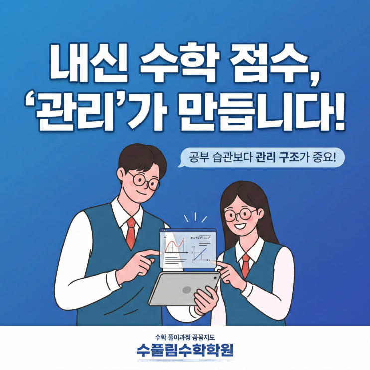 안녕하세요. 수풀림수학학원입니다 :) 내신 수학은 단순히 문제를 많이 푼다고 점수가 오르지 않습니다. 비슷한 공부량인데도 누군가는 점수가 오르고 누군가는 제자리인 이유가 있습니다. 은평구수학학원에서 학생들을 지도하다 보면 점수가 오르는 아이들은 공부 습관보다 먼저 관리 구조가 잡혀 있는 경우가 많습니다. 수풀림수학학원 역시 내신 성적이 오르는 과정은 학생이 혼자 버티는 것이 아니라 학원이 어떻게 관리해주느냐에 달려 있다고 보고 있습니다. ✅ ‘기출 분석’이 아니라 ‘출제 포인트’가 정리돼 있습니다 내신은 학교마다 출제 포인트가 다릅니다. 그래서 은평구수학학원에서는 단순히 기출문제를 반복하게 하기보다 학교....... <img src="https://blogthumb.pstatic.net/MjAyNjAxMTRfMjc4/MDAxNzY4MzU5NjU5ODMw.ZnAB9w9llXAJAhMxFOYg702fv7VHpT5eEyIz51O_JD0g.R_3hShszgp_gr94k9ju90tpgBxjzYSvJYFksfYwOCnog.PNG/Gemini_Generated_Image_x38q6dx38q6dx38q.png?type=s3" />