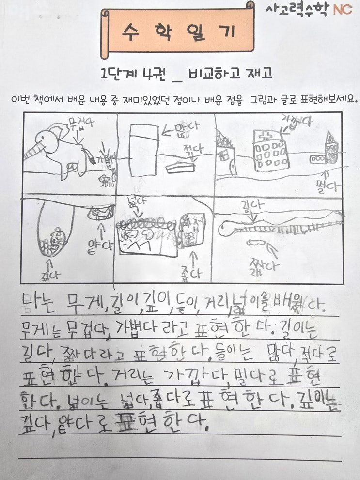 오늘은 우리 반포시매쓰 7세 친구들이 지난 시간에 배웠던 <NC1단계 4권 - 비교하고 재고> 내용을 소개할게요.^^ 측정 영역에 해당하는 이번 교재에서는 길이, 무게 들이 등 여러 가지 비교하는 말을 알아보고, 여러 가지 측정 상황에 맞는 용어와 표현들을 익힐 수 있어요. 그림 카드를 보며 무엇을 비교하고 있는지 생각해 보고, 스티커를 붙여 가며 그 용어가 어떤 뜻을 지니는지 함께 이야기해 보았어요. 평소에 자주 사용하지 않던 표현이거나, 무심코 사용해 왔지만 상황에 맞게 깊이 생각하며 쓰지 않았던 말들이었기 때문에 이번 수업을 통해 그 의미를 정확히 이해하고 올바르게 표현할 수 있게 되었어요.^^ 그리고 사물 속성 카....... <img src="https://blogthumb.pstatic.net/MjAyNTEyMTlfMjYz/MDAxNzY2MTIzODM1OTA2.PE9H85V89vOe9UecKCCaFYq79OALVlaD5wUWyjvyOTIg.B2GfcsV-mYQNezdie-hDYbmf-cBsFSBFM6wtB1kYDcMg.JPEG/%C0%CF%B1%E2.jpg?type=s3" />