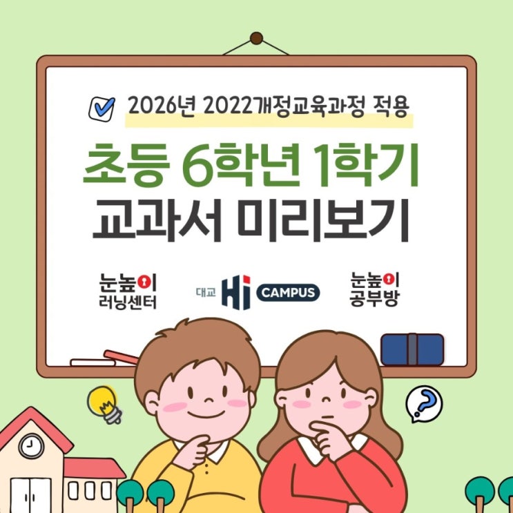 안녕하세요! 학부모님께 알찬 교육 정보를 전해드리는 대교 전주 덕진 하이브입니다~ 2022 개정 교육과정에 맞춰, 2026학년도에는 5.6학년 교과서도 개정이 되는데요 이번 글에서는 초등학교 6학년 1학기 교과서 내용과 공부법에 대해 소개 드리려고 해요~ 2026년부터는 '2022 개정 교육과정'이 초등 고학년까지 적용되면서, 단순 지식 습득을 넘어 비판적 사고와 디지털 리터러시, 그리고 중학교 과정과의 연계성이 더욱 강조됩니다. 새롭게 바뀌는 교과서 단원 내용과 과목별 핵심 공부 전략이 우리 아이들의 자신감 넘치는 학교생활에 도움이 되길 바라면서 국어 과목을 먼저 살펴보도록 할게요~ 국어 [문해력과 디지털 리터러시의....... <img src="https://blogthumb.pstatic.net/MjAyNTEyMjJfMTMx/MDAxNzY2NDA5ODU1OTk5.g0I1Ec8Ptv8k9rpjAGrV1YUfd0m4ffXHLIB4LP6GbDkg.CVGLKASm__DmaY5nkmUFWP5tfrj9UwZbCkHtotkAAEgg.JPEG/900%A3%DF1766396083195.jpg?type=s3" />