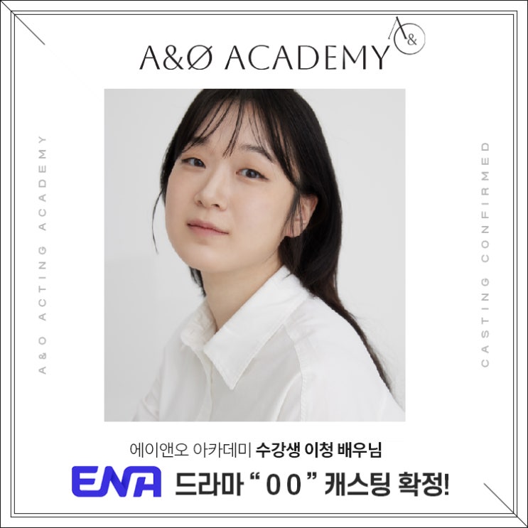 에이앤오 연기학원 수강생 이 청 배우님이 ENA 드라마에 캐스팅 확정되셨습니다! 축하드립니다! 앞으로 더 많은 활동을 이어가실 이청 배우님에게 많은 관심과 응원 부탁드립니다. 에이앤오 연기학원의 캐스팅이 더 궁금하다면?? #캐스팅 #배우지망생 #오디션 #연기 #신인배우 #학원 #연기학원 #오디션정보 #배우 #출연 #드라마출연 #캐스팅 #수업 #연기수업 #캐스팅디렉터 #an캐스팅 #신촌연기학원 #마포구연기학원 #에이앤오연기학원 #ENA #ENA드라마 #비공개드라마 #배역캐스팅 #단역캐스팅 <img src="https://blogthumb.pstatic.net/MjAyNjAxMDZfMjkw/MDAxNzY3NjY3NjE2NTE3.wVG62OaerqDbMYPJ4ka2QHxSzT0ZOp1AnINhpYFsEmog.Zofxer2Y_ZCZNSgblTN47a-WpTd6nvSVExi2mE7odNAg.JPEG/%C0%CC%C3%BB2.jpg?type=s3" />