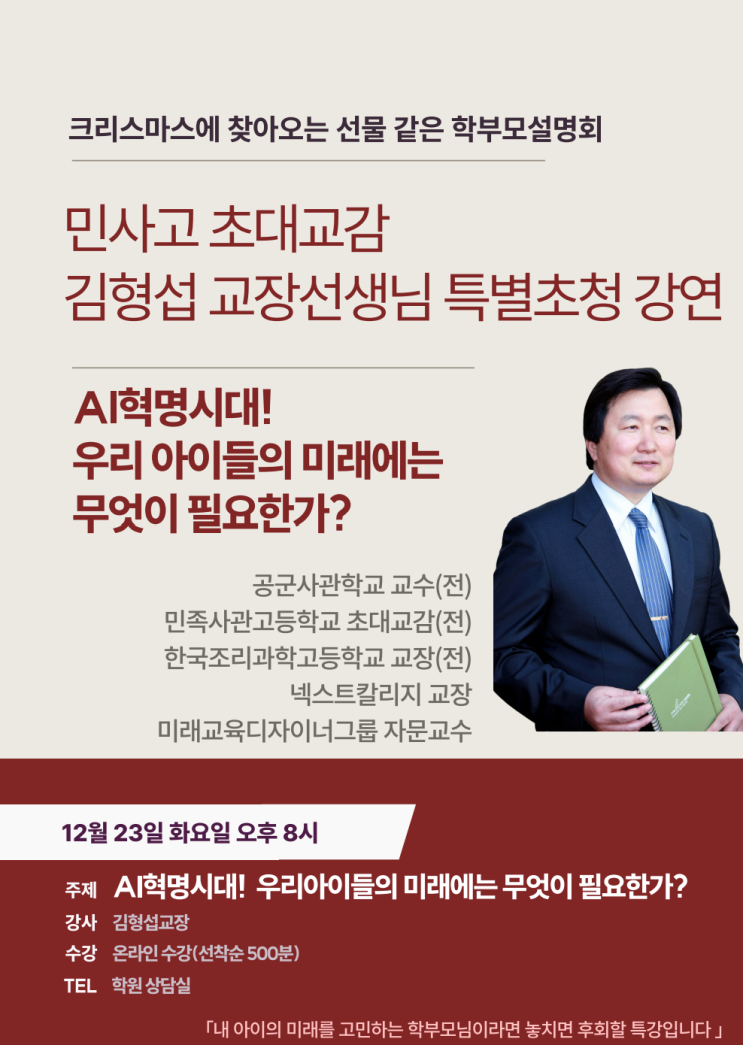 AI 혁명 시대, 우리 아이에게 정말 필요한 역량은 무엇일까요? 막연한 불안이 아닌 교육 현장을 오래 지켜본 전문가의 시선으로 아이의 미래를 점검하는 시간이 준비되었습니다. 민사고 초대교감 김형섭 교장선생님 특별 초청 강연 민족사관고등학교 초대교감을 역임한 김형섭 교장선생님과 함께 AI 시대에도 흔들리지 않는 교육의 본질을 짚어봅니다. 기술 변화 속에서도 아이에게 반드시 길러줘야 할 핵심 역량은 무엇인지, 부모가 지금 알아야 할 방향을 명확하게 전해드립니다. 강연 안내 주제 : AI 혁명 시대, 우리 아이들의 미래에는 무엇이 필요한가? 일시: 12월 23일 화요일 오후 8시 방식: 온라인 강연 (선착순 500명) 참여 방법: 아래....... <img src="https://blogthumb.pstatic.net/MjAyNTEyMTdfMTE5/MDAxNzY1OTY0MjAxOTU4.olsGp9UGYUPTMiRDyJL20v1oIoZeIJaer9_CQCv8h1kg.onEbEi4ifO6oPqR0NI85Uuwl5hPC2Wy7ifYExGngVJAg.PNG/image.png?type=s3" />