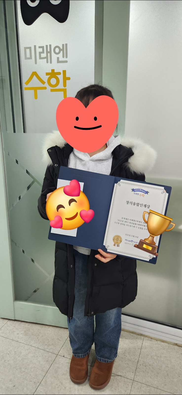 미래엔영어수학서교학원에 다니고 있는 친구들은 수학실력과 성적이 나날이 쑥쑥 올라가고 있습니다. 공부에 진심인 친구들이 모여 좋은 학업 분위기를 만들며 모두가 조금씩 나아가는 공부의 진정한 맛을 느끼며 학업에 열중하고 있기에 선생님들은 진심으로 응원하며, 칭찬합니다! 좋은 성적으로 수상한 우리 친구들 축하합니다~~ 2026년도에도 더욱 화이팅 해봐요! 우리 예쁘고 멋진 친구들 얼굴사진을 올리고 싶었지만, 사생활을 보호하여야 하니까~ 올해는 전원 창의융합상을 수상할수있으리라는 희망으로 더욱 기분이 좋아지네요 ^^ <img src="https://blogthumb.pstatic.net/MjAyNjAyMDZfNTkg/MDAxNzcwMzQxNDUzMjQ5.AG-BZYJV1P5rlpqNmHnKvBfV5d-5gIkJlx0VTbNGeJMg.wi8l9DsMEeeHpKJ85Cvla0IAgDy6PgZWSQVzIwVxsa4g.JPEG/KakaoTalk_20260206_100552077_01.jpg?type=s3" />