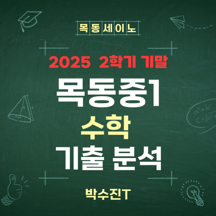 안녕하세요. 목동중등수학학원 목동세이노입니다. 오늘은 목동중등수학학원 세이노의 박수진선생님께서 기출분석 해주셨습니다. 목동중 1학년 문항별 분석 목동중학교 1학년 2학기 수학은 평면도형과 입체도형이 주를 이루는 '기하'의 단원입니다. 이번 시험은 총 25문항으로 구성되었으며, 다각형, 작도와 합동, 입체도형의 겉넓이와 부피 등 전 범위에서 골고루 출제되었습니다. 특히 주목할 점 두가지! 배점의 차별화 3점(기초)부터 5점(심화)까지 난이도별 배점이 뚜렷합니다. 특히 후반부 23~25번 문항은 '다각형' 단원의 심화 유형으로 배치되어 변별력을 높였습니다. 고난도 유형 집중 '삼각형의 합동 활용'....... <img src="https://blogthumb.pstatic.net/MjAyNjAxMTFfMjEz/MDAxNzY4MTAwMzIyMDY5.BsbwIhZBH5qv4KtV5sQDIhfXxrexQuqm5VnULi0RYskg.P3WxCFgS5Ym1ujCIceFPi45hGlxrviRSY8bwEnooanog.PNG/KakaoTalk_20260106_164907109.png?type=s3" />