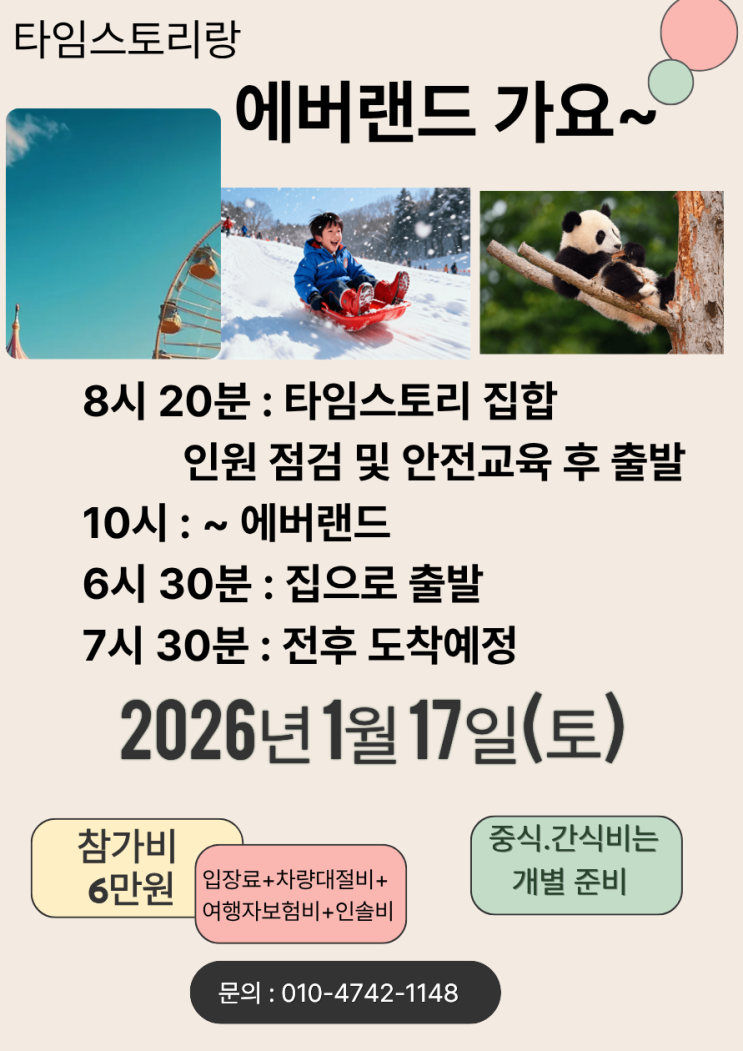 1월 17일 토요일 에버랜드 출발 공지사항입니다. 8시 20분까지 타임스토리 집합 인원 체크 및 안전 교육 전달 후 8시 30분 아이파크 정문 앞 차량 탑승 후 출발하겠습니다. 차량 탑승 출발과 함께 카톡이 아닌 단체 문자로 전달 사항 공지드리겠습니다. 47인승 버스에 45인 탑승 가능한데 7명 인원이 늦게 신청해서 선착순으로 45명만 가려다가 차량 한대 더 대절해서 총 두 대가 이동합니다. 47인승 버스 인솔자 포함 37명 탑승 25인승 버스 인솔자 포함 15명 탑승 혹시 모를 안전사고를 위해 여행자 보험을 들고 체험학습을 진행합니다. 작년까지는 체험학습 하루 행사로 진행해도 되었는데..... 올해부터는 체험학습도 생년월일 앞자리를 입력....... <img src="https://blogthumb.pstatic.net/MjAyNjAxMTVfMTcg/MDAxNzY4NDQ0OTkyMTY0.3smI2cfu9tcw2HUlOxqgexrdEBL5FIibDMBngP-smpsg.nEiXSKQ9jOwuuY5Z0Bs7NSo3o9aDAICopnzzevw47UUg.PNG/%C1%A6%B8%F1%C0%BB_%C0%D4%B7%C2%C7%D8%C1%D6%BC%BC%BF%E4._%285%29.png?type=s3" />