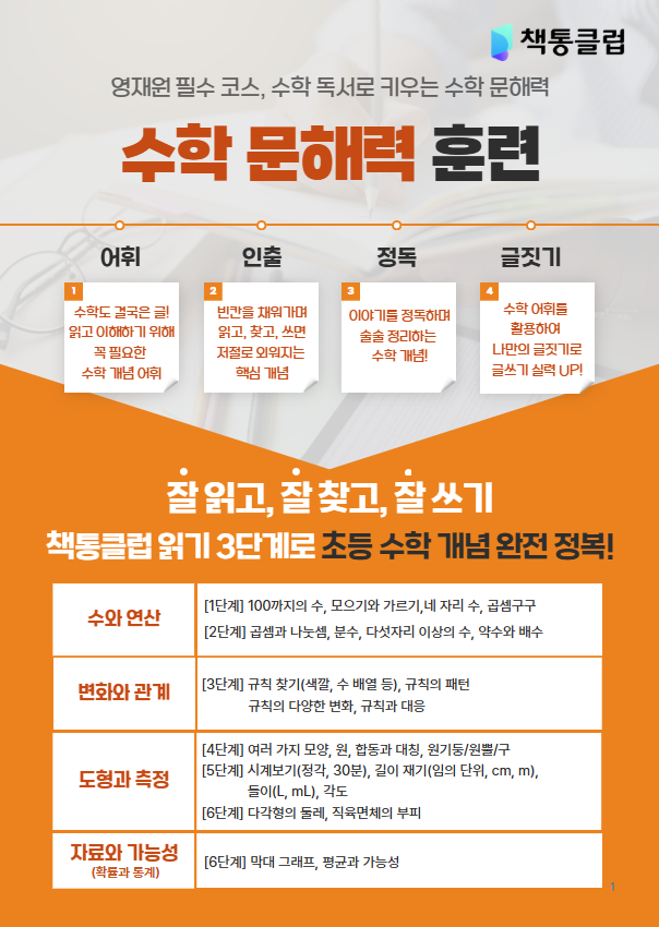 책통클럽에 아이가 수학문제를 이해하지 못 해서 찾아오시는 부모님들이 많이 계십니다. 사실 수해력은 독해력과 수학적인 사고가 결합되어야 가능합니다. 그냥 책만 많이 읽는 것으로는 부족한 부분이 있습니다. 그래서 저희 책통클럽은 수학적 사고를 기르며 독해력도 같이 상승시킬 수 있는 수해력 교재도 함께 지도하고 있습니다. 학년별 교과과정에 나오는 수학개념을 책으로 먼저 이해하고 워크지에 개념들을 적어내며 익힌 내용을 정리합니다. 문제풀이 기술이 아닌 개념이해가 선행되어야 응용과 심화가 가능해집니다. 이렇게 공부한 저희 친구들 학교에선 얼마나 자신감있을지 상상되시죠?^^ 자세한 문의사항은 아래 번호로 연락주시면....... <img src="https://blogthumb.pstatic.net/MjAyNjAzMjlfNzgg/MDAxNzc0NzY1ODU3MDY3._tM2UreNOc1q3nTMJf-lHtgIawpE2Fr2sxjHpzaCiKEg.F35OWArEnMIwwFw2yIk8VQg4uQc7HpkAD77OEuVTbv4g.PNG/1774411401765.png?type=s3" />