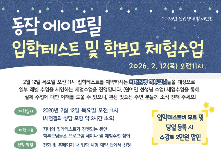 2026년 병오년 새해를 맞이하여 비재원생 학부모님들을 대상으로 한, 동작에이프릴의 일부 레벨 수업체험 및 2차 세미나가 2월 둘째주 진행됩니다. 평소 April어학원 프로그램에 관심을 갖고 계셨던 분들과, 동작에이프릴 수업이 궁금하신 비재원생들 학부모님께서는 2월 12일(목) 오전 11시 입학테스트 및 수업체험세미나 참석 예약을 통해 궁금증을 해소하실 수 있으니 많은 관심 부탁드립니다! 동작구, 영등포구, 여의도 지역 셔틀 운행 (셔틀비 없음) 신길초, 보라매초, 대방초, 여의도초, 윤중초, 영화초, 영신초, 대림초, 영본초, 대영초, 문창초, 대길초, 신상도초, 강남초, 중대부초, 동광초, 리라초 등 25개 초등학교에서 모인 학생들이....... <img src="https://blogthumb.pstatic.net/MjAyNjAyMDJfMTAw/MDAxNzcwMDIyNTQ0NzU4.BRvHexyKeEI2BAyn6FJFxehvlkRwioGSaJ6hdq5Gd80g.C8b0JtUkAFrLcxU1TQWRXiPCb1Xob03nAQP2_SRWrAMg.JPEG/%C1%A6%B8%F1%C0%BB_%C0%D4%B7%C2%C7%D8%C1%D6%BC%BC%BF%E4_%2818%29.jpg?type=s3" />