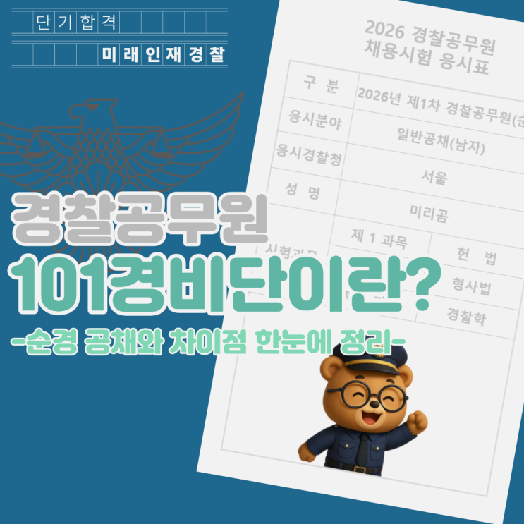 안녕하세요. 미래인재경찰학원입니다. 오늘 준비한 내용은 순경 공채와 함께 시험을 치르는 101경비단에 대한 내용입니다. 오늘 올라오는 경찰공무원 공고와 함께 살펴보시면 좋을 것 같습니다. 그럼 시작해 볼까요? 경찰공무원 시험을 준비하다 보면 대부분은 순경 공채를 먼저 떠올리지만, 경찰 조직에는 특정 임무에 특화된 채용 경로도 존재합니다. 그중 대표적인 예가 바로 101경비단입니다. 이번 글에서는 ✔️ 101경비단이 어떤 조직인지 ✔️ 순경 공채와 무엇이 다른지 ✔️ 채용 인원·시험 일정·조건까지 수험생 입장에서 꼭 필요한 정보만 정리해드립니다. 101경비단이란? 101경비단은 서울특별시경찰청 직할대로, 청와대 경비·경....... <img src="https://blogthumb.pstatic.net/MjAyNjAyMDZfOTcg/MDAxNzcwMzUzNTU1ODQ5.8v2CE0y8kx_R-VEv4S9hfcM3afsfvMPFvfvIGU6C8xkg.othtP7Fr1bYHYLQ79s8rgpKGUovHpGJkaxLUtf0x9Xsg.PNG/1.png?type=s3" />