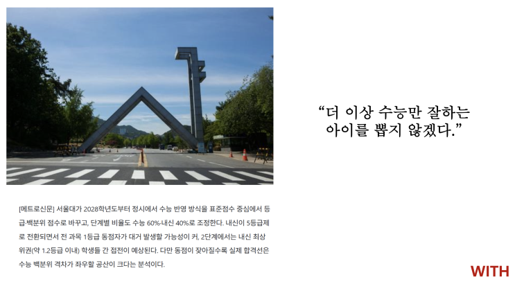 오늘 위드학원에선 바뀐 교육개정안과 그에 따른 학원 선택 방안에 대해서 얘기해 보았습니다. 바뀐 교육 개정안은 아이들이 빠르게 진로선택을 하도록 하게 했지만 대신에 성적말고도 관리해야할 부차적인 것들을 더 많이 가중시켰습니다. 혼란을 많이 느꼈던 어머님들이 소수지만 방문해주셨고 바뀐 교육개정안에 대한 질의응답을 통해 어머님의 궁금증을 해결해드렸습니다. 또한 고1을 앞둔 어머님들에게 어떤 학원을 고르시는게 올바른 선택이실지에 대해서도 설명을 드렸습니다. 영어에 있어 무엇보다 중요한 건 입니다. 선생님이 중학생, 고등학생만을 맡아 보았는지. 혹은 수능생만을 맡아 보았는지. 또는 전 학년을 맡아보았는지가 굉장....... <img src="https://blogthumb.pstatic.net/MjAyNTEyMTlfMzkg/MDAxNzY2MTEwODQ3MDU3.4ugYs-nlHph3cQT_feV1sRjvIWHRiJa2gefo0r1qShIg.MYLkjXXmdlDQSzmXFegz5fJbPGh1Y40i3GpfUI2OoM0g.PNG/image.png?type=s3" />