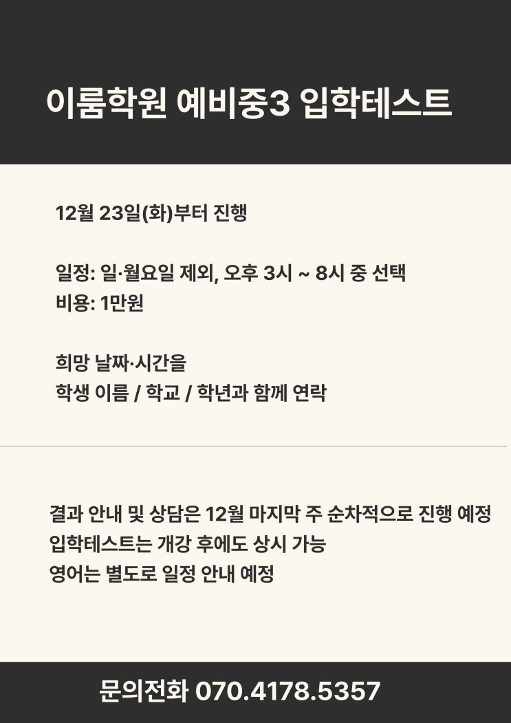 예비중3 입학테스트 안내드립니다. 12월 23일(화)부터 진행 예정입니다. 학생만 학원으로 방문하면 됩니다. 일정: 일·월요일 제외, 오후 3시 ~ 8시 중 편한 시간을 선택하시면 됩니다. 비용: 1만 원 결과 안내 및 상담전화는 12월 마지막 주에 순차적으로 드릴 것입니다. 테스트를 원하시는 분은 희망 날짜·시간을 학생 이름 / 학교 / 학년과 함께 댓글 남겨 주시거나 학원으로 연락 부탁드립니다. 입학 테스트는 개강 여부와 상관없이 진행할 것입니다. 늦었다고 생각 마시고 언제든 연락 주십시오. ※ 영어 입학테스트는 일정 정해지면 별도로 안내 드릴 예정입니다. ※문자 안내는 웹 발신이다 보니 가끔 오류가 생겨 전송이 안 될때가 있습니....... <img src="https://blogthumb.pstatic.net/MjAyNTEyMjBfMTQ4/MDAxNzY2MjM2MTg3NjE3.pM9_uSjj3tqq2hAb_T9pOy-jcLHdbPfkowRT6mkmiCYg.Q999-pMUQ5Dj8RDky6L7QnsvwwpivSb2Q6UkfhiEp_Mg.JPEG/%C1%A6%B8%F1_%BE%F8%C0%BD_%287%29.jpeg?type=s3" />