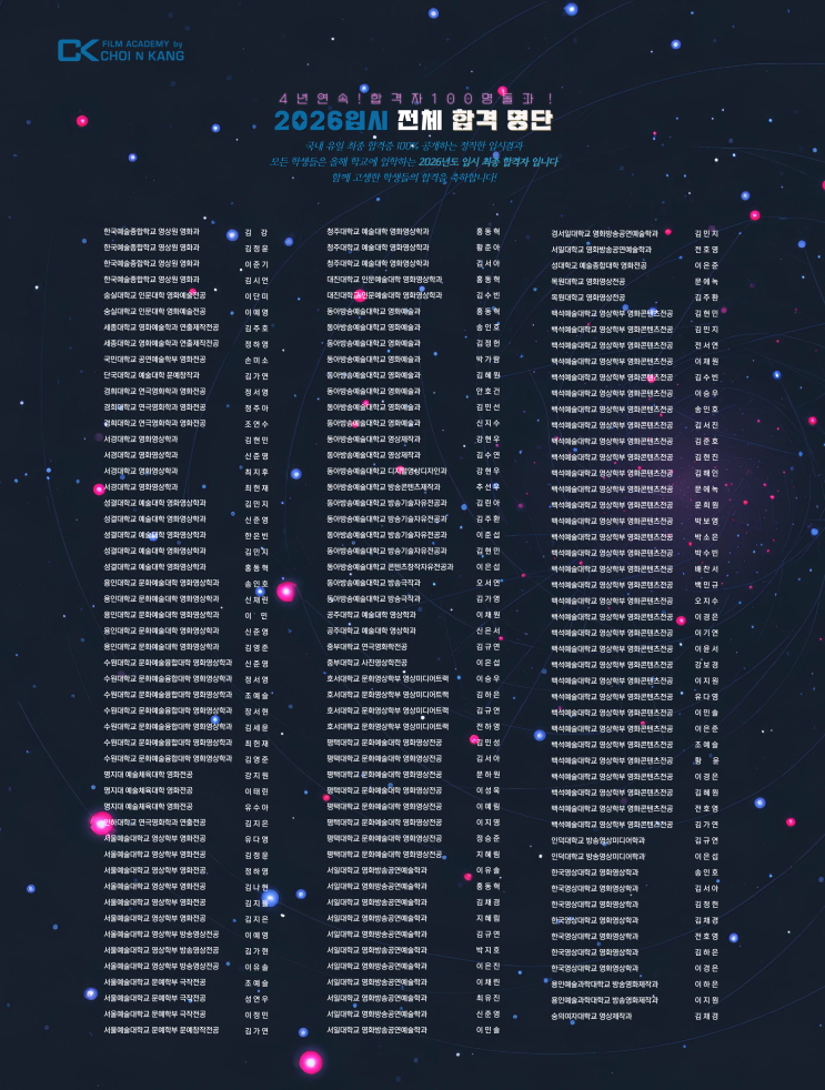 합격은 단순한 결과가 아니라, 끝까지 포기하지 않았던 시간의 기록입니다. 처음 한 줄의 이야기를 쓰던 순간부터 자신의 이야기를 믿고 버텨온 시간들이 이 결과로 이어졌습니다. 합격한 모든 학생들에게 진심으로 축하의 마음을 전합니다. 그리고 지금도 자신의 이야기를 만들어가고 있는 모든 학생들의 시간을 응원합니다. 최앤강 영화학원은 앞으로도 학생 한 명, 한 명의 가능성을 믿고 끝까지 함께하겠습니다. 아래는 2026 최종 합격자 명단입니다. — CK FILM ACADEMY 최앤강 영화학원 최앤강 영화학원은 1차 합격, 예비 합격이 아닌 최종 합격 기준으로 합격자 명단을 공개합니다. 상담 문의 문의 : 최앤강 카카오채널 ( 최앤....... <img src="https://blogthumb.pstatic.net/MjAyNjAzMDRfMjkw/MDAxNzcyNTk3ODExNTAw.1-UuiWyTJPjXmT_noXzjcRaDNsrVq5apWPqC1r54bgkg.n-mAsjB9TXOy47timN_u76jqBniGt5hGNk2J7dQO8iYg.PNG/%C7%D5%B0%DD%C0%DA-%B8%ED%B4%DC_%C8%A8%C6%E4%C0%CC%C1%F6%BF%EB_-001_%281%29.png?type=s3" />