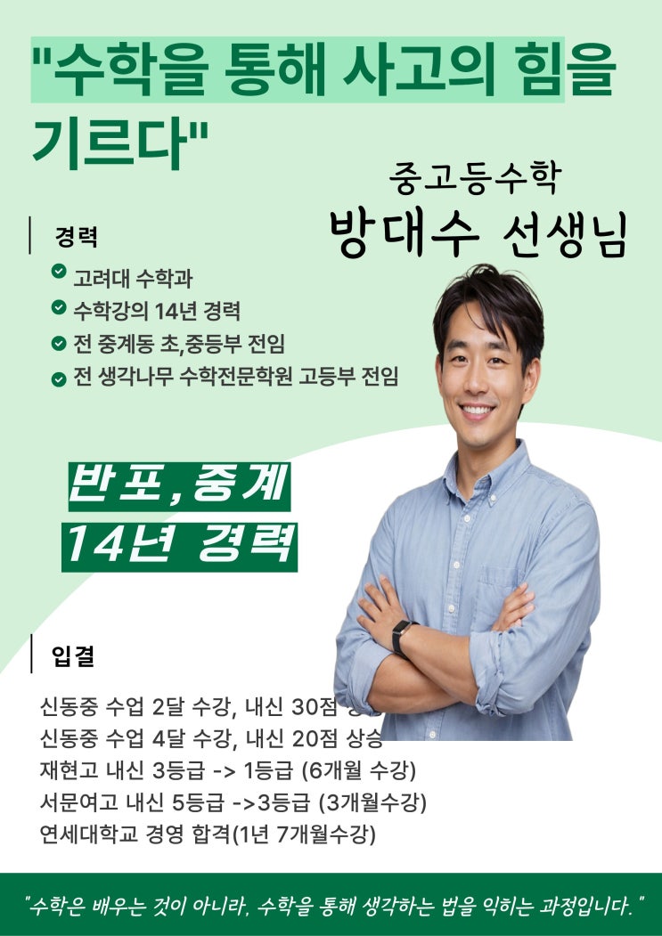 강남과 서초, 반포 지역을 넘어 이제 둔촌포레온에서도 상위권 수학의 기준을 만들어가고 있습니다. 22년 전통의 노하우를 담아, 둔촌동 지점에서 우리 아이들의 수학적 사고력을 책임질 방대수 선생님을 소개합니다. 단순히 공식을 암기하는 수업이 아닌, '스스로 생각하는 힘'을 길러주는 방쌤의 교육 철학을 확인해 보세요. 방쌤의 "수학을 통해 사고의 힘을 기르다"- 중등부터 고등까지 이어지는 탄탄한 입결 수학은 단절된 과목이 아닙니다. 중등 내신의 폭발적인 향상은 물론, 고등 수학의 기초가 되는 심화 사고력까지 확실하게 잡아냅니다. 내신 단기 수직 상승 : 재현고 내신 3등급 -> 1등급 (6개월 수강) , 서....... <img src="https://blogthumb.pstatic.net/MjAyNjAzMDRfNTEg/MDAxNzcyNjA0MjUwOTU1.Ow8wt27g_aYfn6ZZQtwmd6IkYdmheAHlwrxz02YMPmUg.78xKnsv0_fdEtegMCBWJwKazFisp7k5y_RwHGs9tzbQg.JPEG/1.jpg?type=s3" />